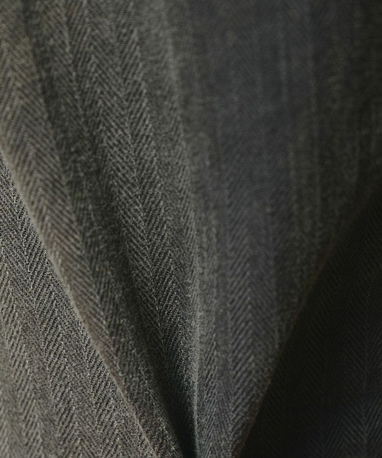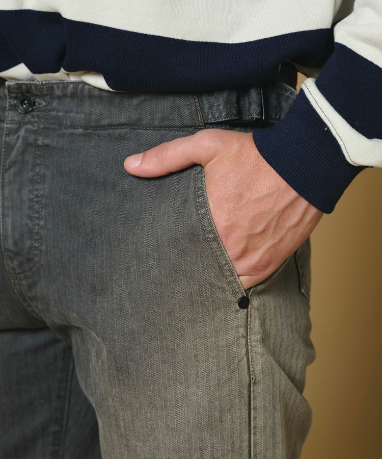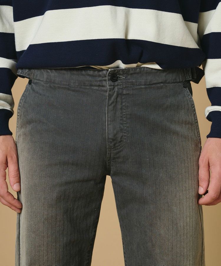 織り柄が美しいヘリンボン生地を使用したパンツ。一つひとつ手作業で加工を施し、ヴィンテージ感あふれる風合いと他にはない絶妙なコントラストを実現しました。カジュアルすぎず、キレイめに着こなせるバランスの良さも魅力のひとつ。Tシャツやスウェットと合わせたリラックススタイルはもちろん、シャツと組み合わせて上品にまとめたスタイリングもおすすめです。