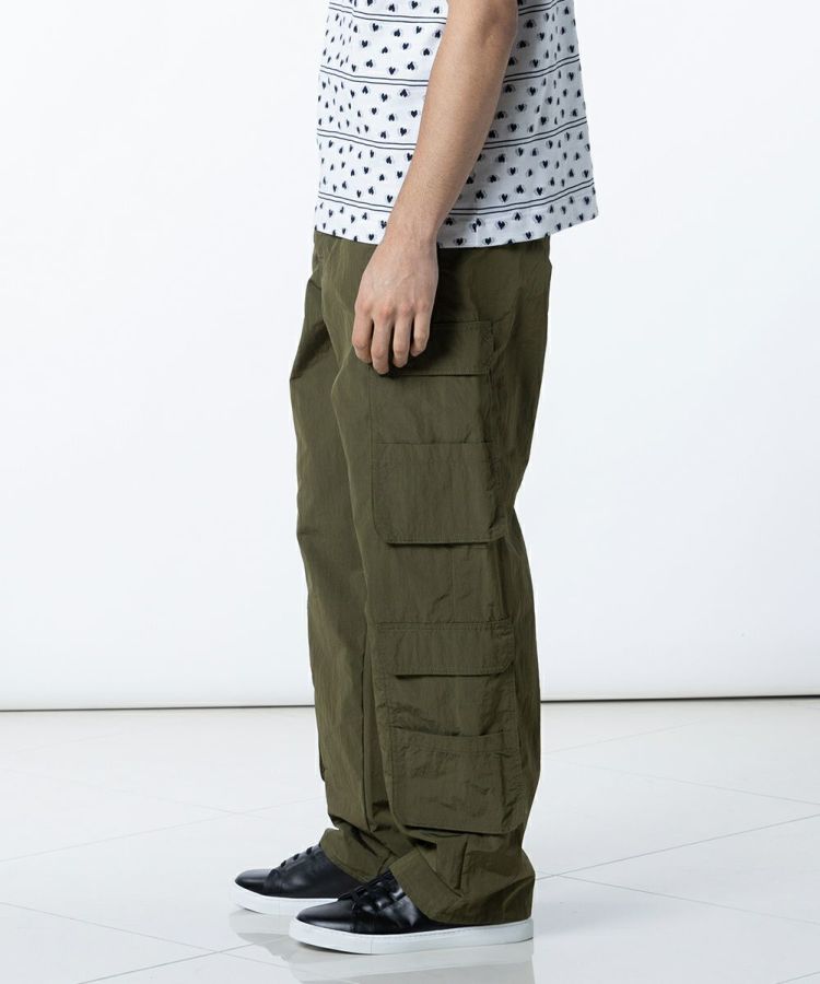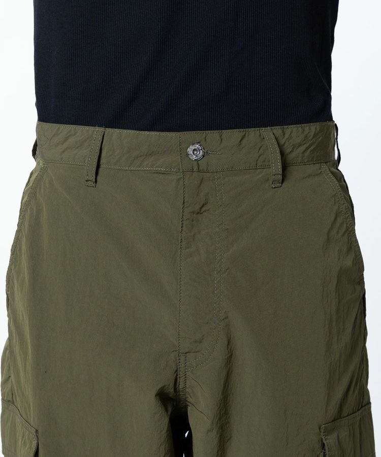 ボリューム感のあるデザインがコーディネートを格上げするナイロンカーゴパンツ。軽量のため穿き心地抜群です。ポリエステルとリサイクルナイロンを合わせてアルカリ処理した糸を使用。ふくらみ感としなやかさ、しっとりとした手触りのタフタ素材に仕上げました。スポーティーな雰囲気がありながらも上品な光沢があり、カジュアルになりすぎず大人っぽく着られる一本です。