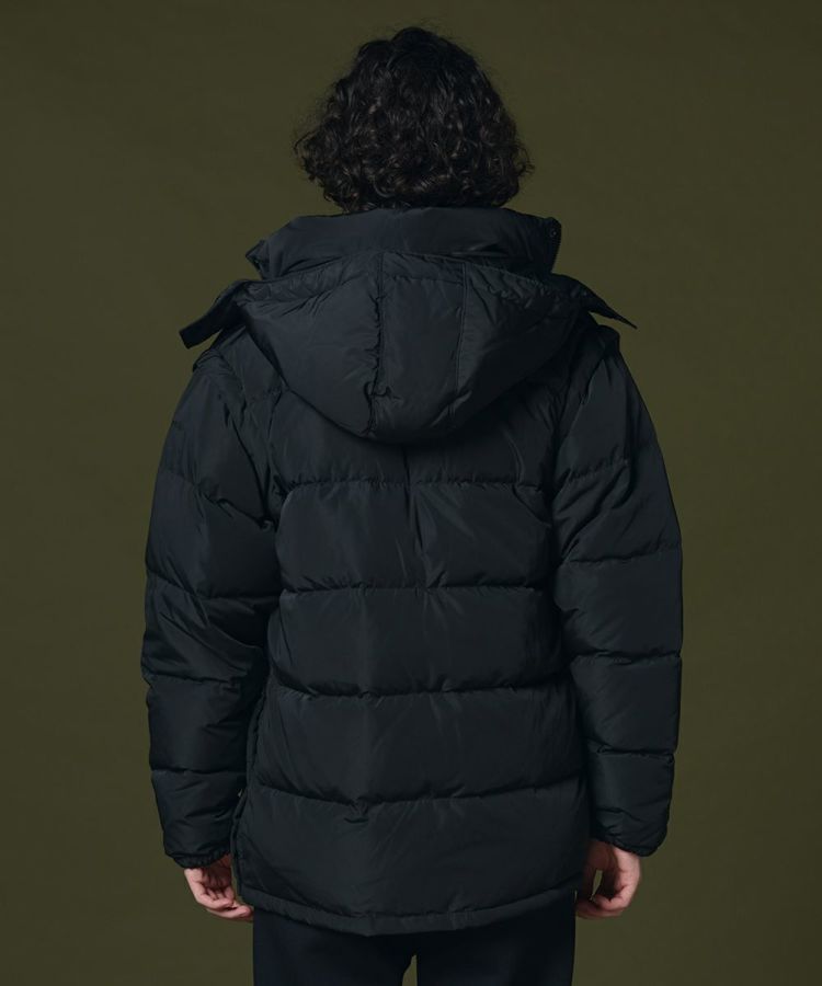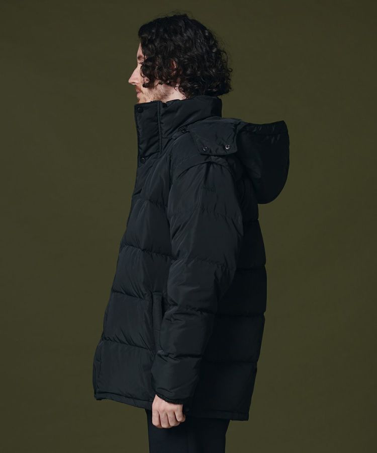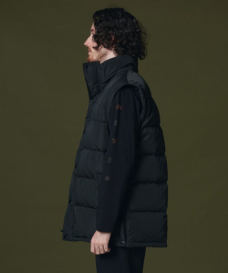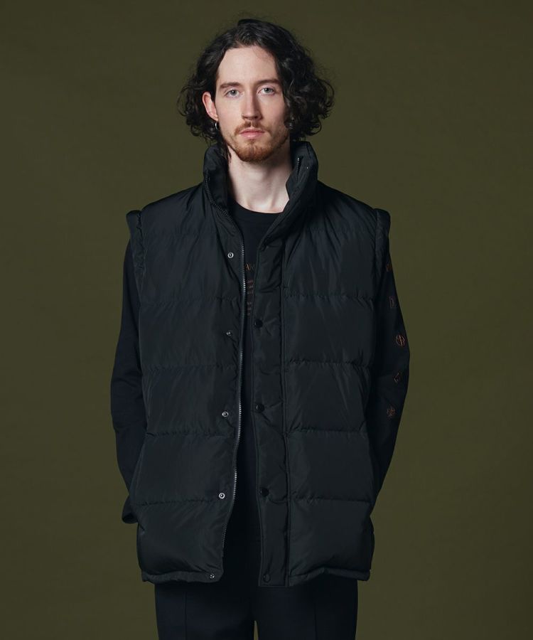 程よいボリューム感がありながらも、きれいなシルエットに仕上げたダウンジャケット。ボタンやジップも同色にすることでミニマムなデザインに。ダウンジャケットでもカジュアルになりすぎず、上品に着られるのが魅力です。また、フードだけでなく袖を取り外してダウンジレとして楽しむことができます。