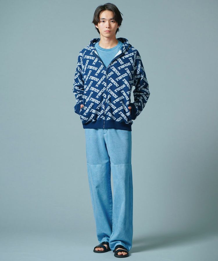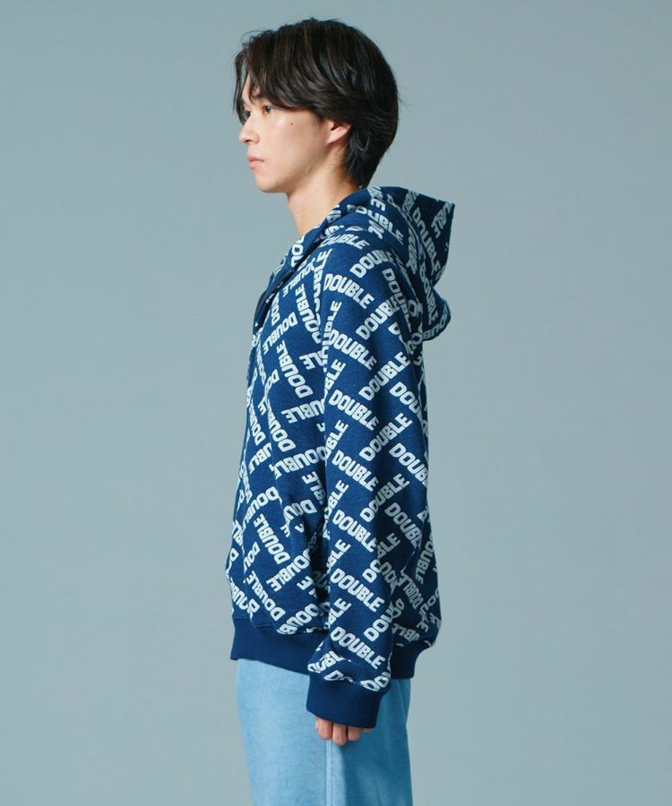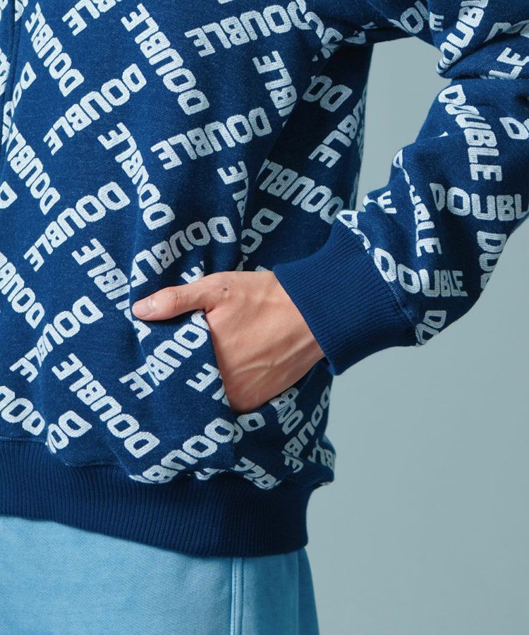 ダブスタのロゴで作ったモノグラム柄がユーモアたっぷりのパーカー。ジャガードの裏毛素材は完全なオリジナルになっています。これひとつでコーディネートが賑やかになるカジュアルアイテムでありながら、落ち着いたブルーのカラーリングが着まわし力抜群。コットン100%で肌触りがいいのも魅力です。