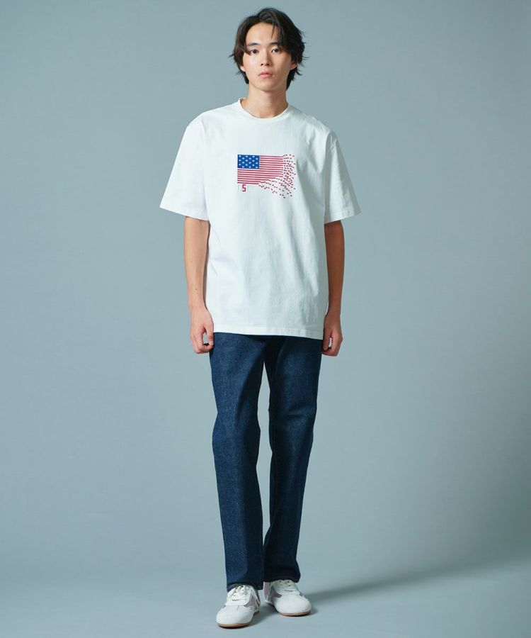 遊び心のあるアメリカ星条旗を刺繍したTシャツ。ゴム製のレゴブロックになった刺繍は、一つずつ手作業で取り付けた圧着シートを使用しています。生地はコットン100%のバスク天竺素材で、肌触りは抜群。春のインナーはもちろん、夏はこれ一枚で今年らしいアメカジ風コーデが楽しめます。