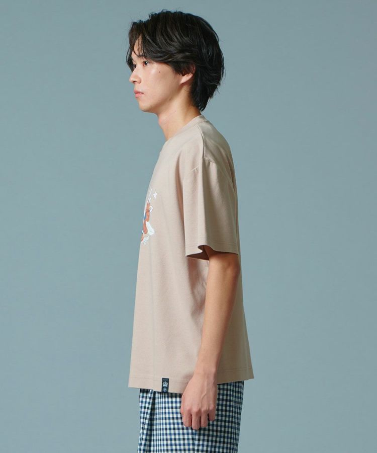 サーフィンとスケボー、両方を欲張りに楽しむクマを柔らかなタッチでプリントしたTシャツ。絶妙な肉感が魅力の定番人気のフライス生地に特殊加工を施し、さりげない艶感とハリ感を出し、きれいめカジュアルなムードに仕上げました。ストレッチ性があり、着心地が良いのもポイント。バックスタイルのロゴもアクセントになっています。