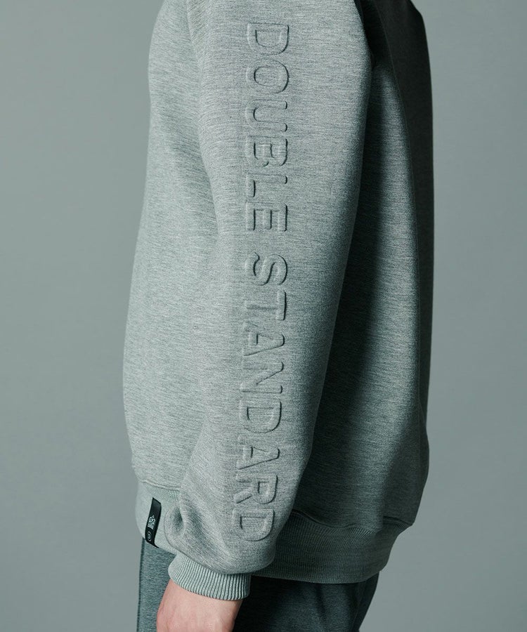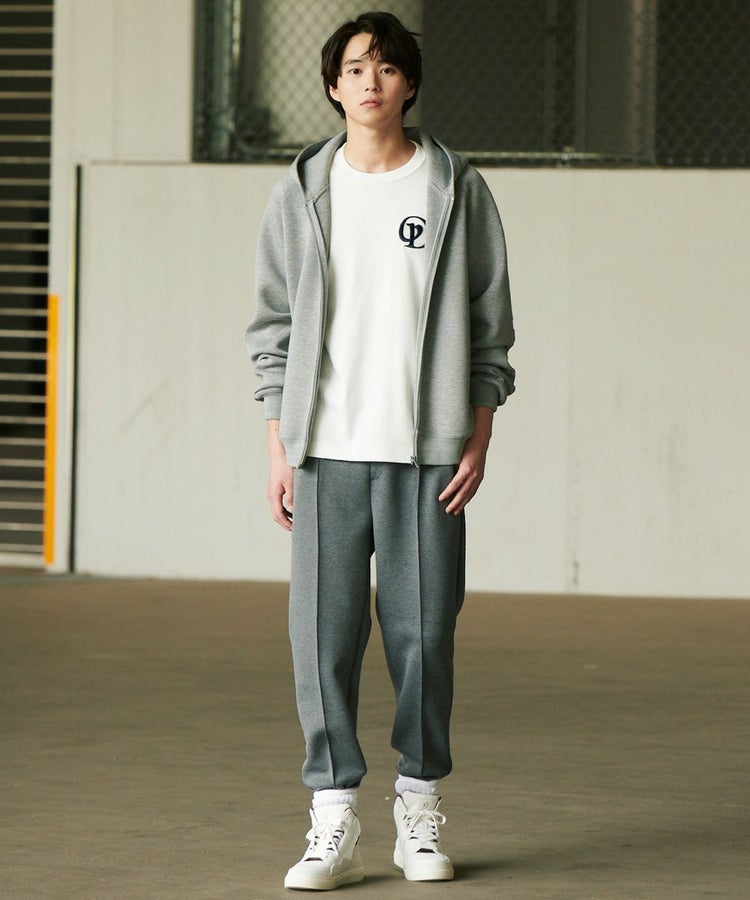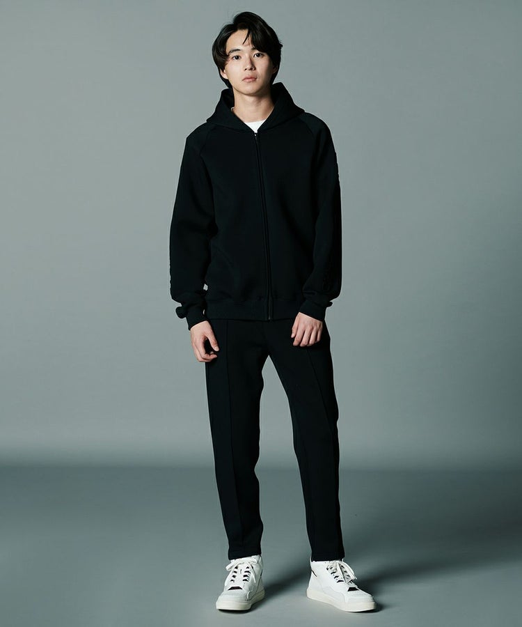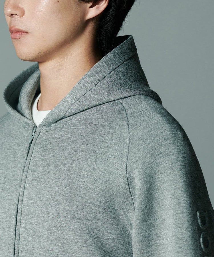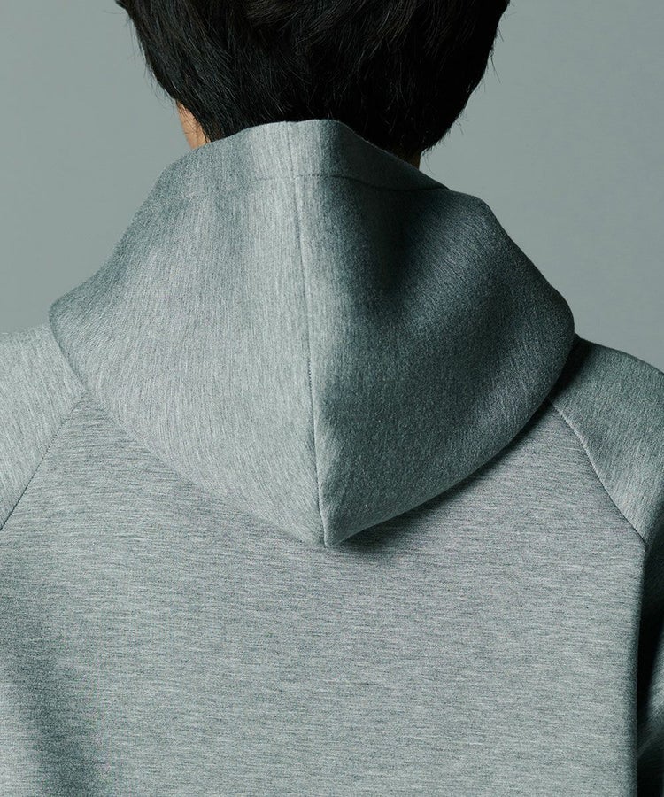 しっかりとした落ち感のあるダンボール生地を使用したジップパーカー。型を起こし樹脂を流し込んで表現したこだわりの凹凸ロゴを袖にあしらい、唯一無二のポイントにしました。ゆったりとしたオーバーサイズシルエットで、さっとラフに羽織れる一枚。なめらかな表面感なのでカジュアルになりすぎず、上品な印象を与えてくれるのが魅力です。