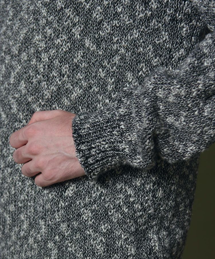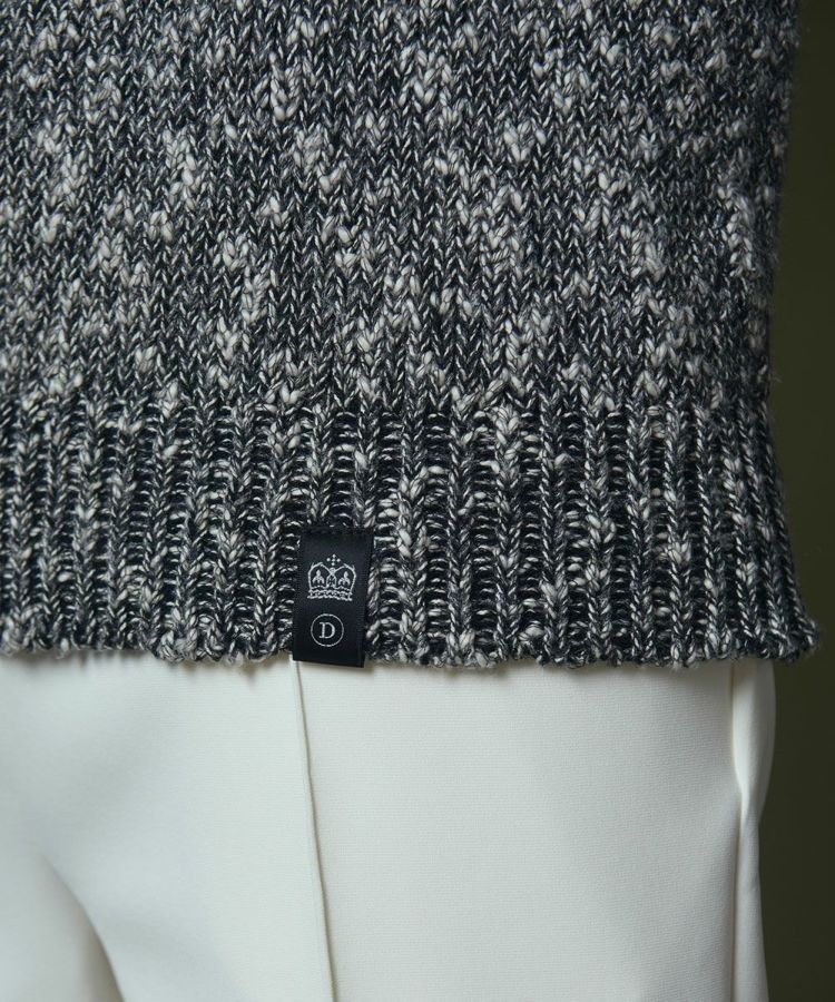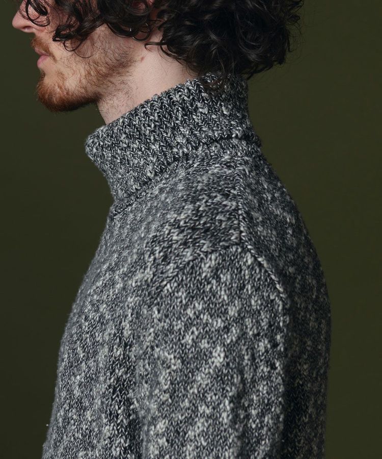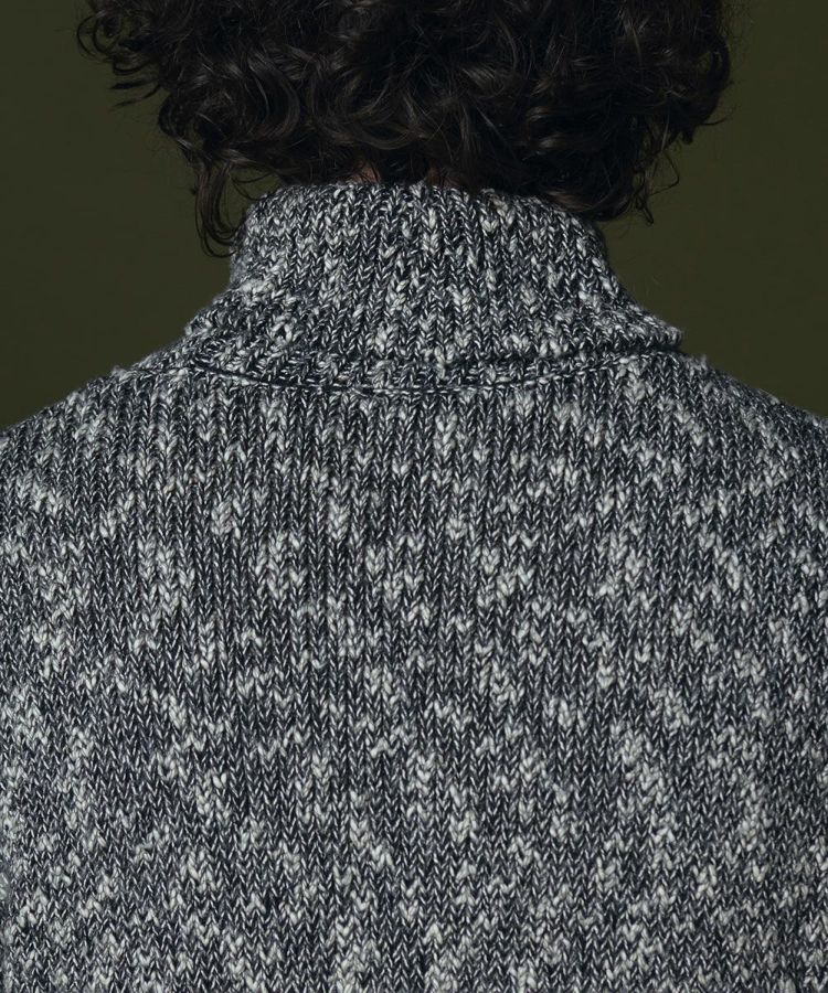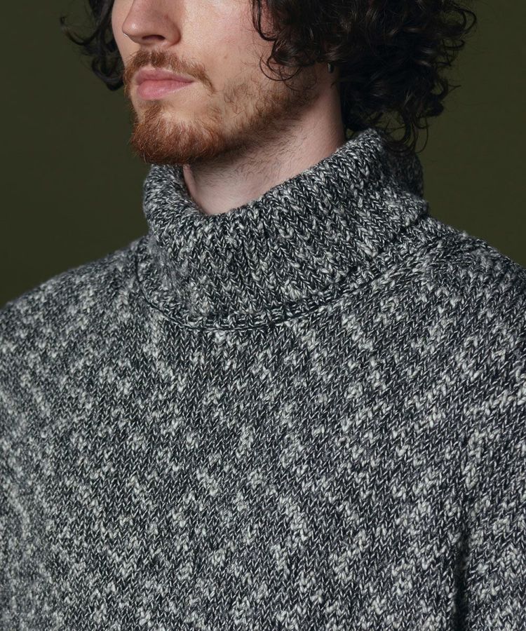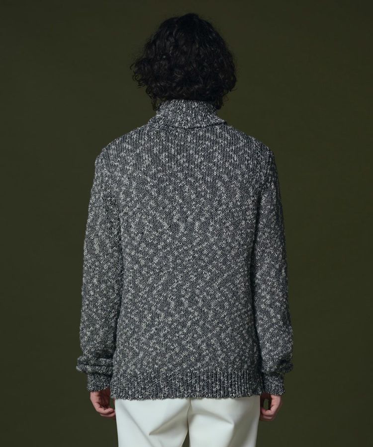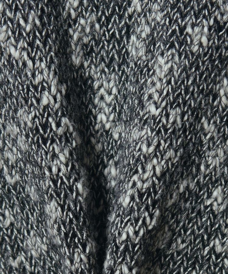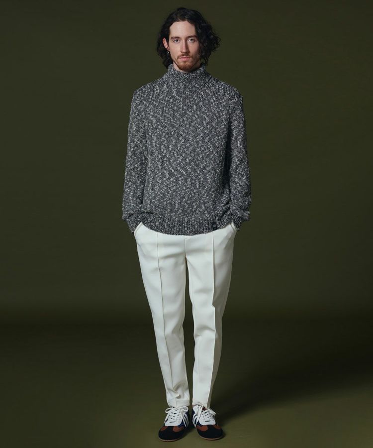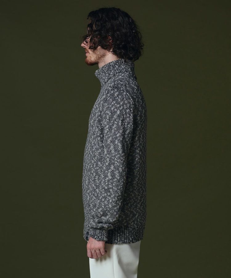 表面の起毛感が特徴になった、ブークレ素材のニットトップス。ゆったりとしたサイズやハイネック仕様がリラクシンなムードながらも、モノトーンな杢カラーが都会的な表情を与えてくれます。ドライタッチでさらさらと着られるのも魅力的。デニムに合わせてもきれいめにコーディネートできるアイテムです。