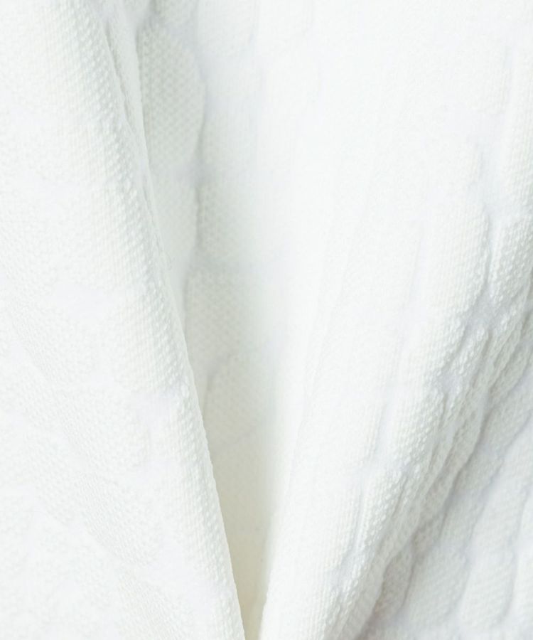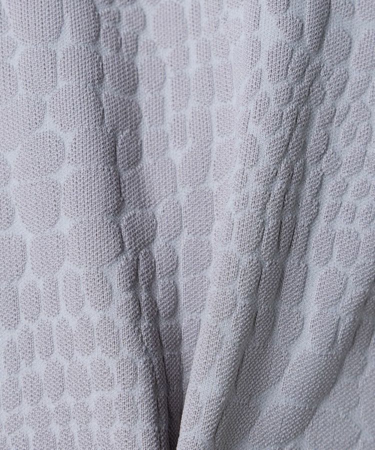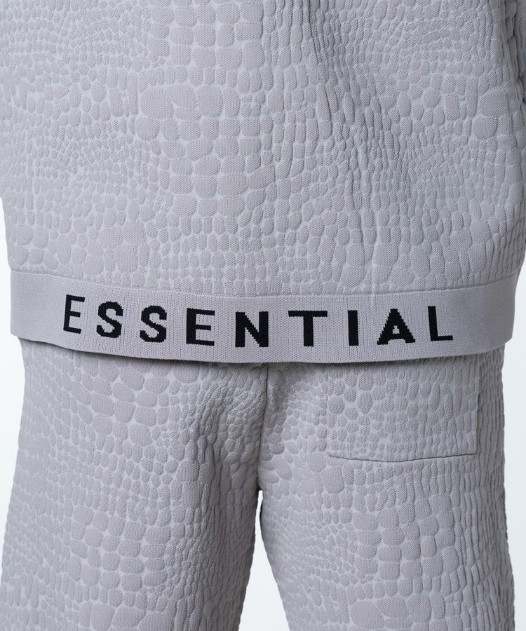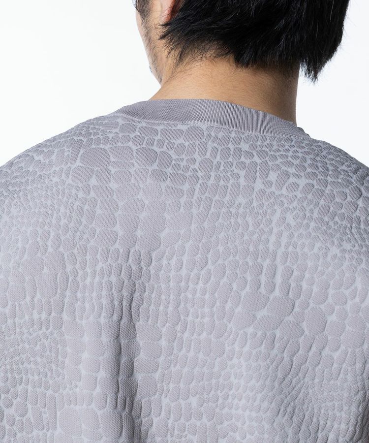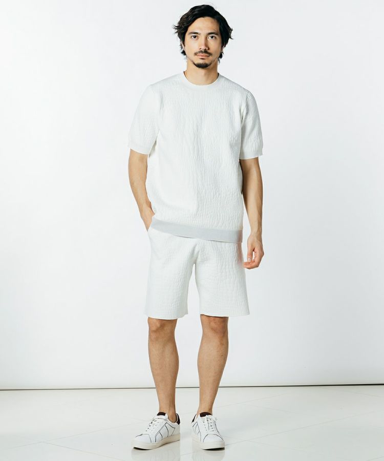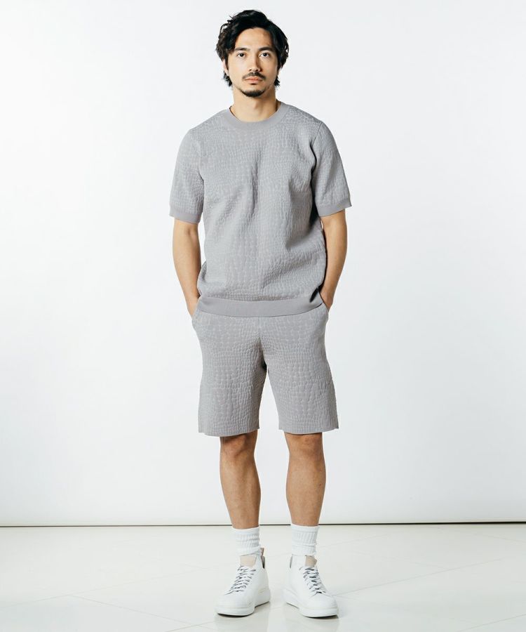 型押しの模様がラグジュアリーなムードをプラスする、ニットTシャツ。裾のESSENTIALのロゴがアクセントになっています。ニット生地なので柔らかく、型押しでもリラクシンに着られるのが魅力的。こなれ感のある大人カジュアルスタイルにぴったりな一枚です。同素材のパンツ(型番:0706051232)とセットアップで着こなすのもおすすめ。
