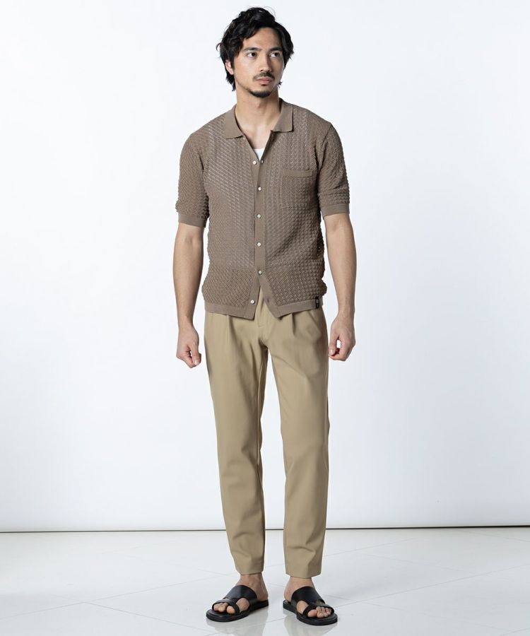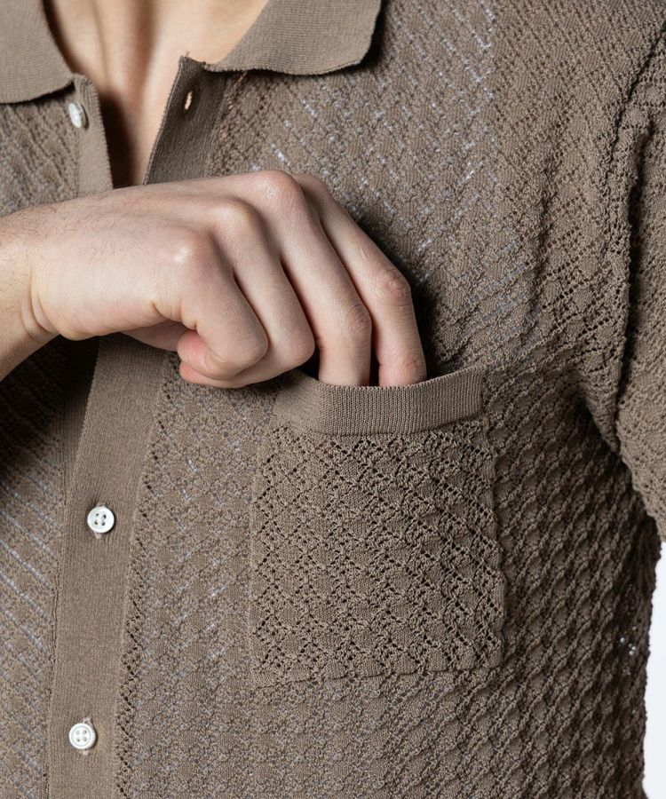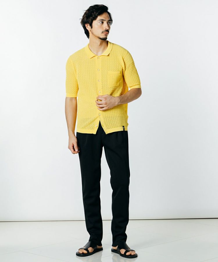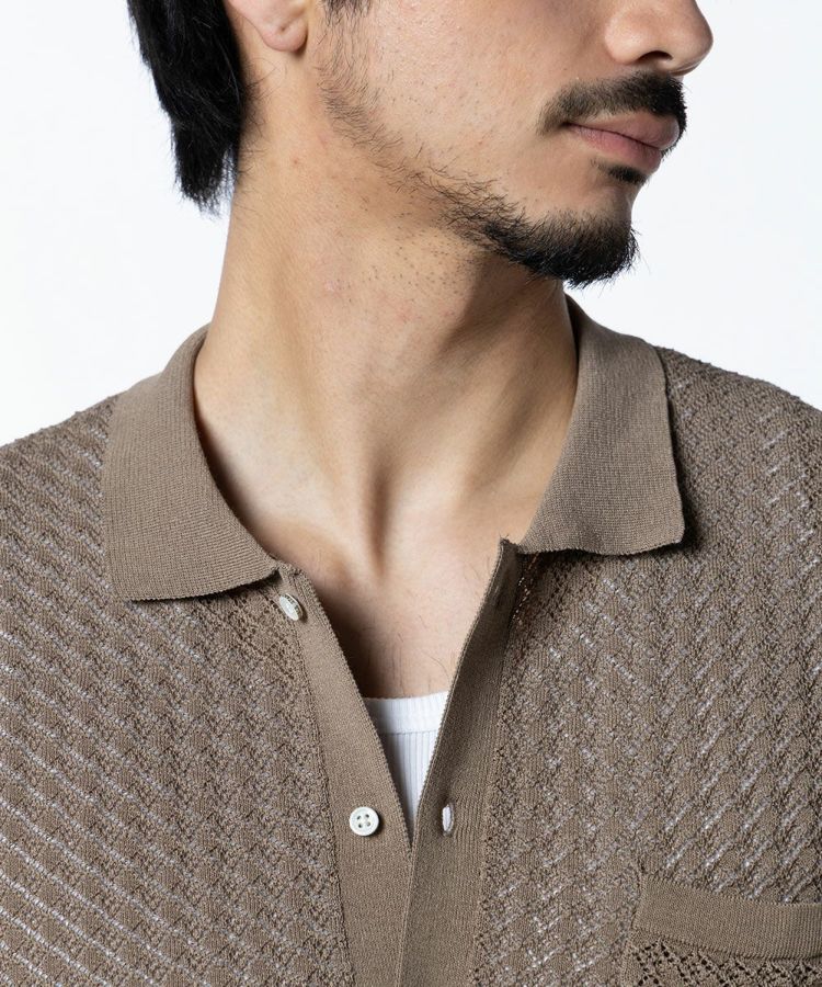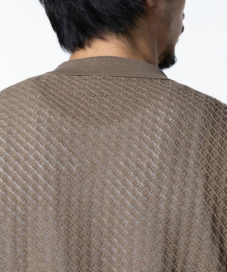 シアーな生地が涼しげな、メッシュニットシャツ。透かし模様でもしっかりとした仕立てに見えるよう、肌触りの良いコットンポリエステルの混紡素材を使用しています。総針編みをベースにした、凝った作りのアイテム。柔らかなニット生地がポイントで、リブを太めに取り身体に程よくフィットするシルエットに仕上げています。