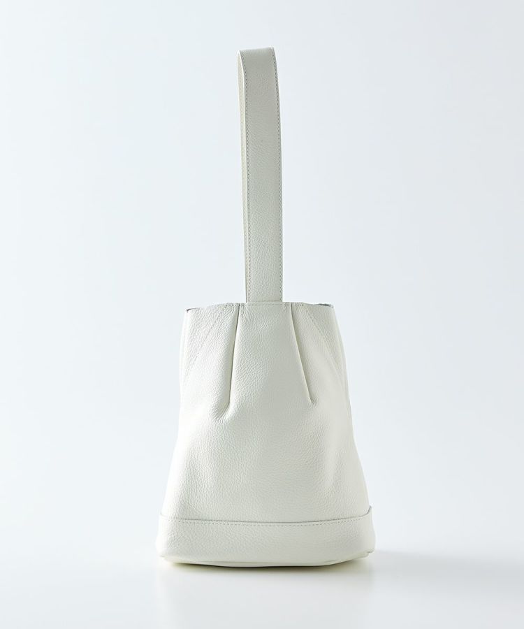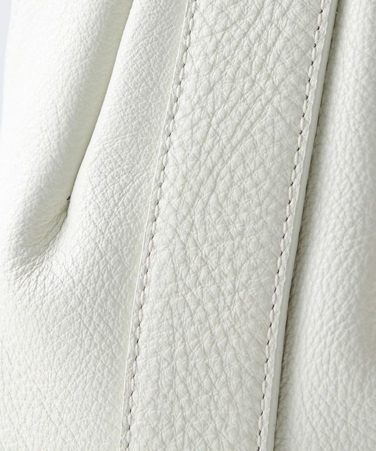 なめらかでキメの細かな子牛レザーを使用したバッグ。巾着タイプのコロンとしたフォルムとワンショルダーがリラクシンな印象を与えます。タックやボトムの切り替えを入れることでデザインに変化をプラス。また、コーディネートに合わせた時に抜け感が出るアイテムながらも、耐久性に優れた高級レザーの上質感で大人のこなれ感を演出できます。