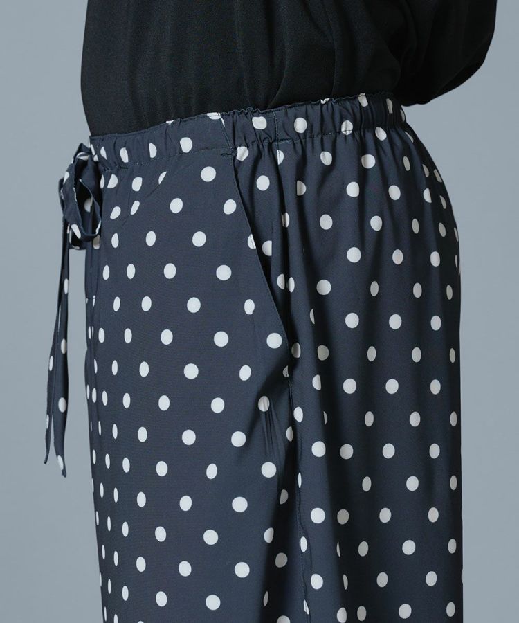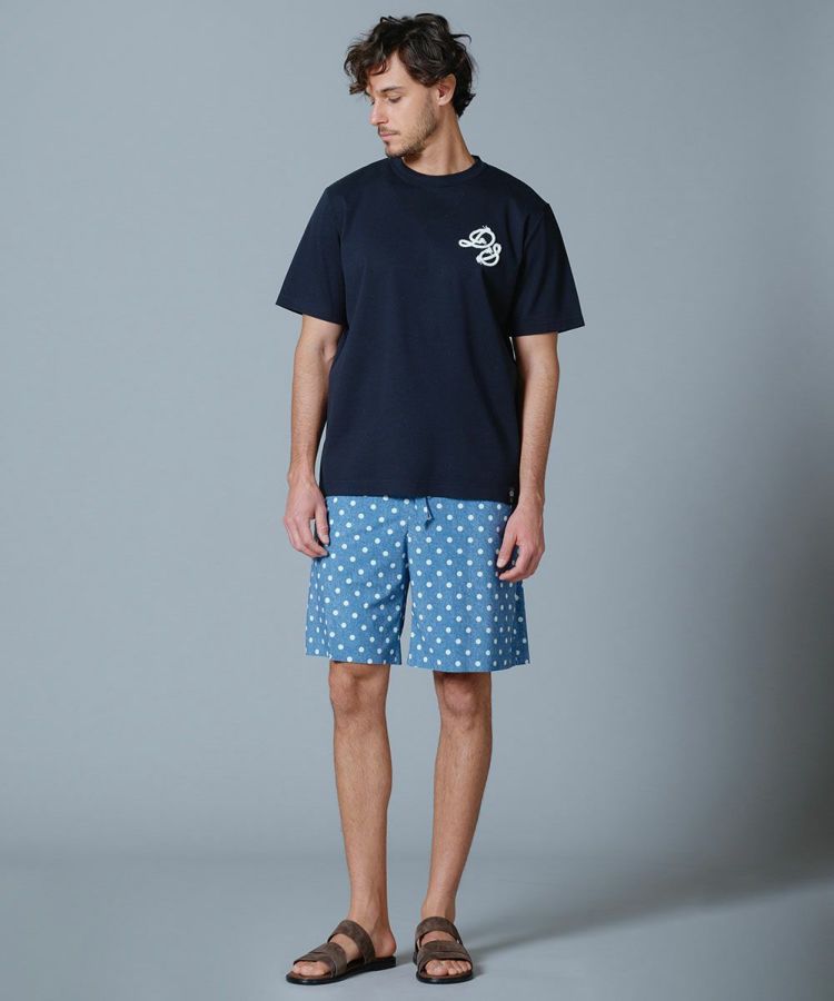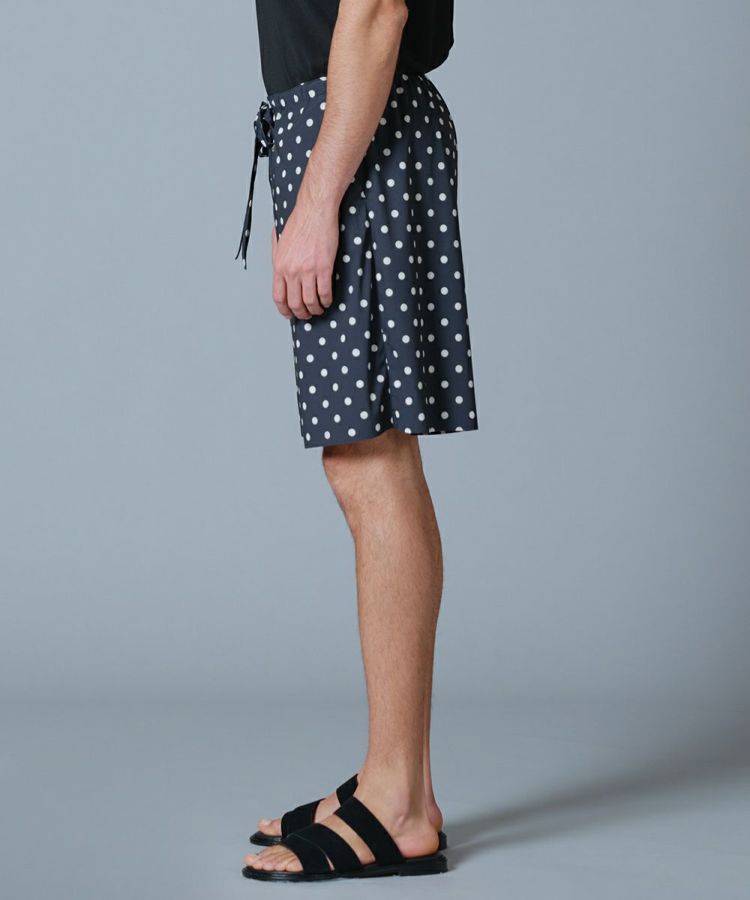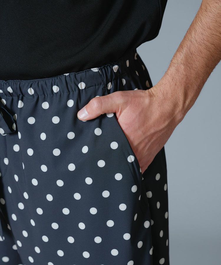 ドット柄が目を惹く、デザイン性に優れたハーフパンツ。ポリエステルトリコットン素材にプリントを施し、接触冷感や吸水速乾といった機能性が高い点も魅力的です。トップスをタックインすれば、ウエストのリボンがさりげないアクセントになって、きれいめな印象に。同素材のシャツ(型番:0704050253)と合わせると、爽やかな夏のセットアップコーデが完成します。