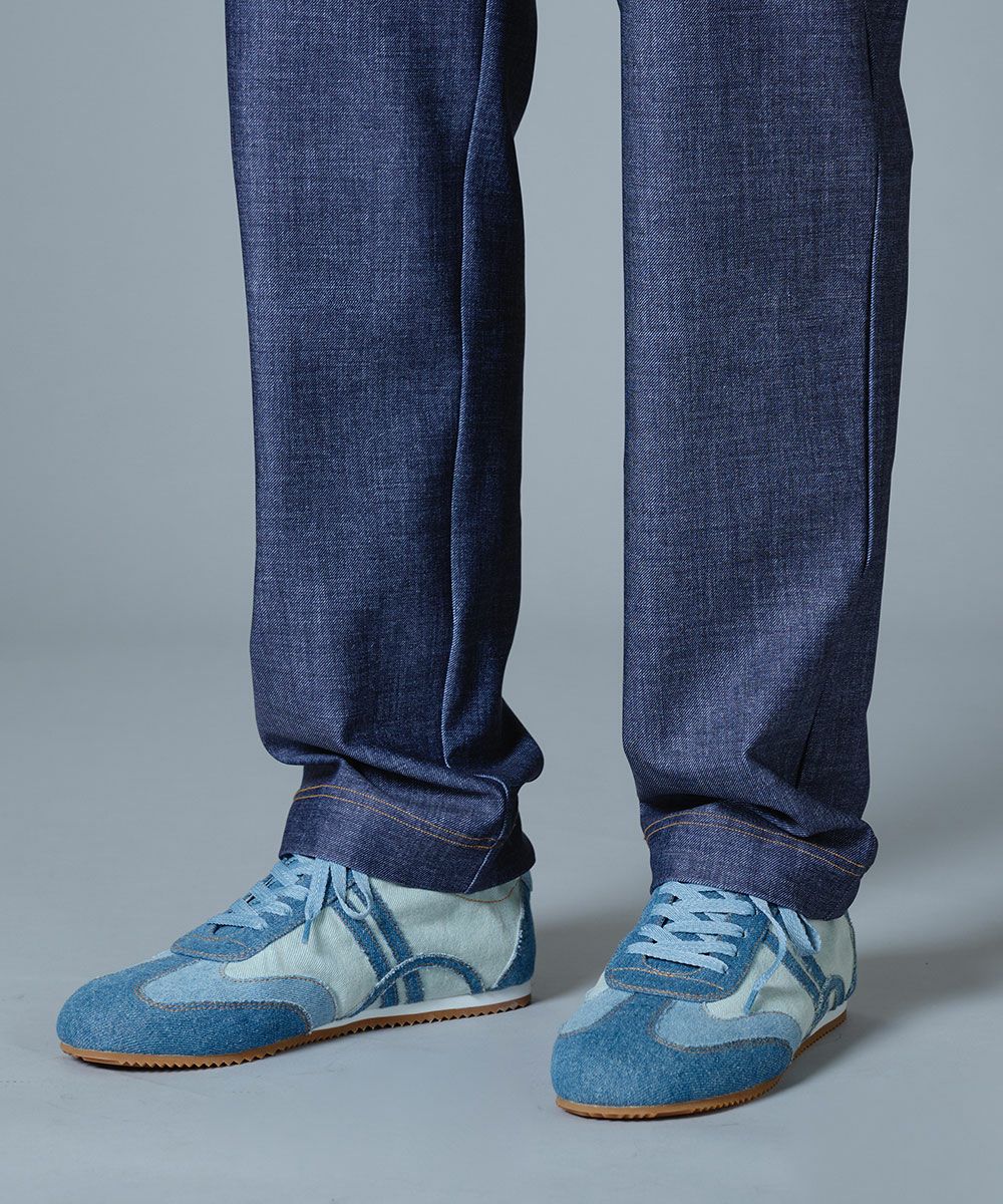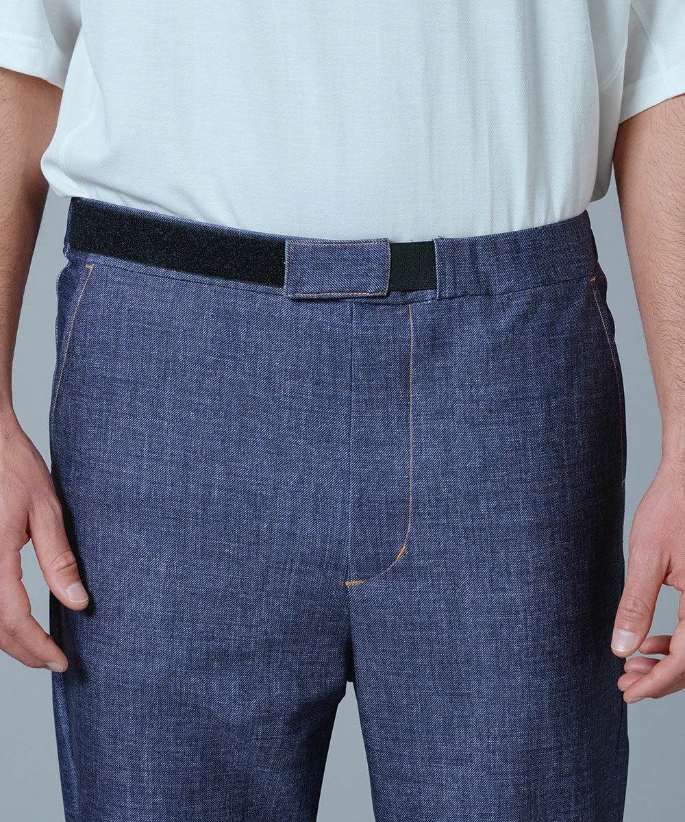 リアルなデニム柄を転写プリントしたデザイン性が高いパンツ。程よい伸縮性と柔らかさを兼ね備えたトリコット素材を採用し、機能面にも配慮しました。カラーは爽やかなサックスとシックなインディゴの2色で展開。同素材のTシャツ(型番:0708070253)と合わせれば、一味違うデニムセットアップコーデを楽しめます。