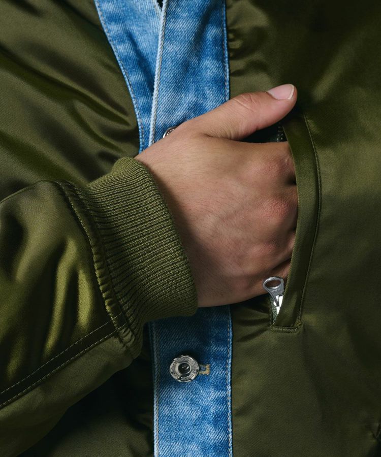 グロッシーな光沢と程よい厚みが、大人カジュアルなスタイルを叶えるブルゾン。柔らかく軽やかなナイロンツイル素材で、快適な着心地を実現しました。別布にはコットン14ozデニムを使用し、ブリーチバイオ加工でヴィンテージライクな表情をプラス。異素材MIXのデザインがダブスタらしい個性を演出し、羽織るだけでこなれ感が出るアイテムです。