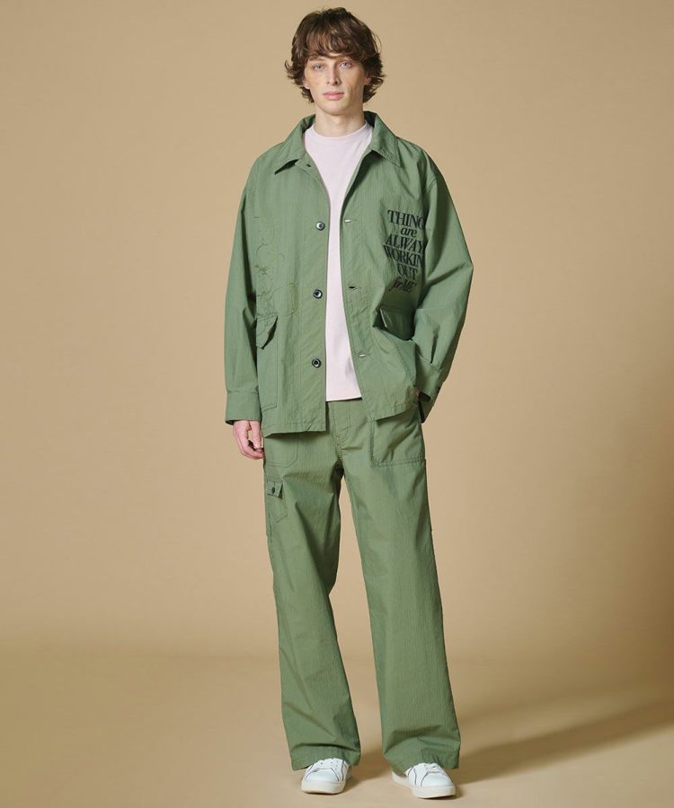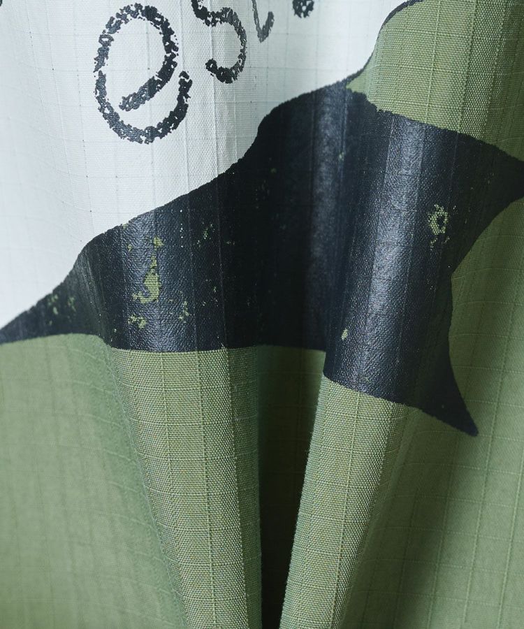ビッグシルエットが抜け感を演出するミリタリージャケット。コーマ糸のオーガニックコットンとリサイクルナイロンを交織したリップストップ生地に、特殊反発+光沢仕上げ加工を施しました。大胆に配したニジタロウモチーフとロゴ刺繍が、唯一無二の存在感を放つ一着に。同素材のパンツ(型番:0706131261)と合わせれば、統一感のあるミリタリーテイストのセットアップスタイルも楽しめます。