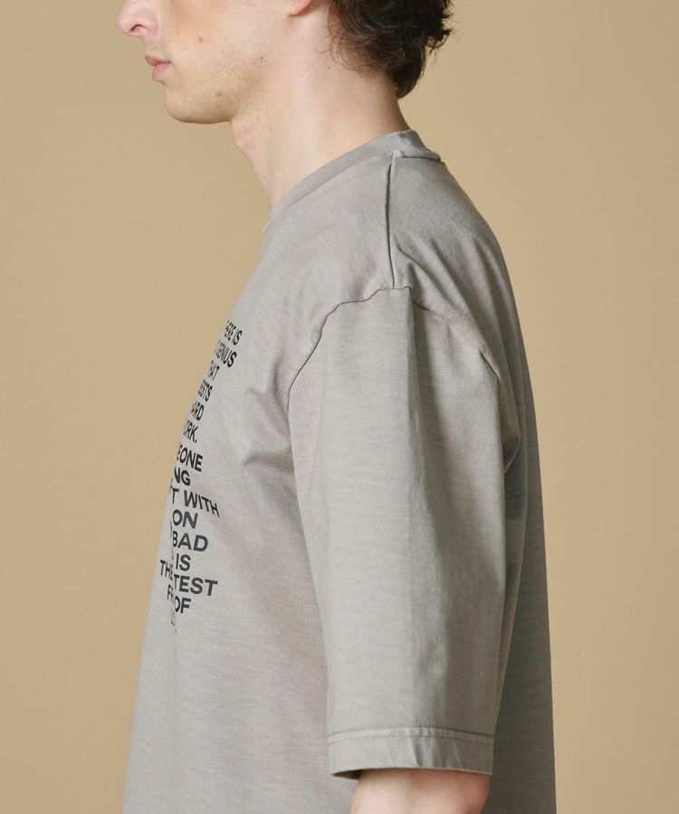 ハリ感のある天竺素材にインクジェットプリントとピグメント加工を施し、ヴィンテージライクな風合いに仕上げたTシャツ。バックには大きな一輪の花を配し、後ろ姿に印象的なアクセントを添えました。カラーはやさしくスタイリングに馴染むベージュを採用。こだわりの加工とプリントが生むこなれ感で、デニムとの相性も抜群な一枚です。