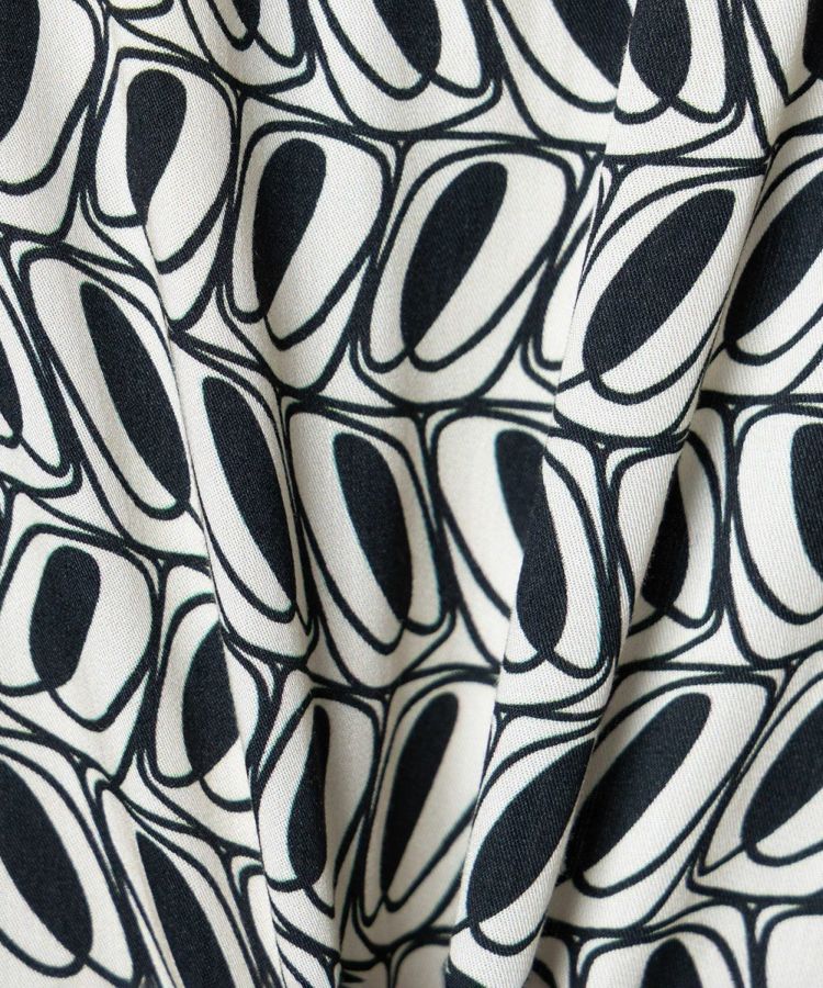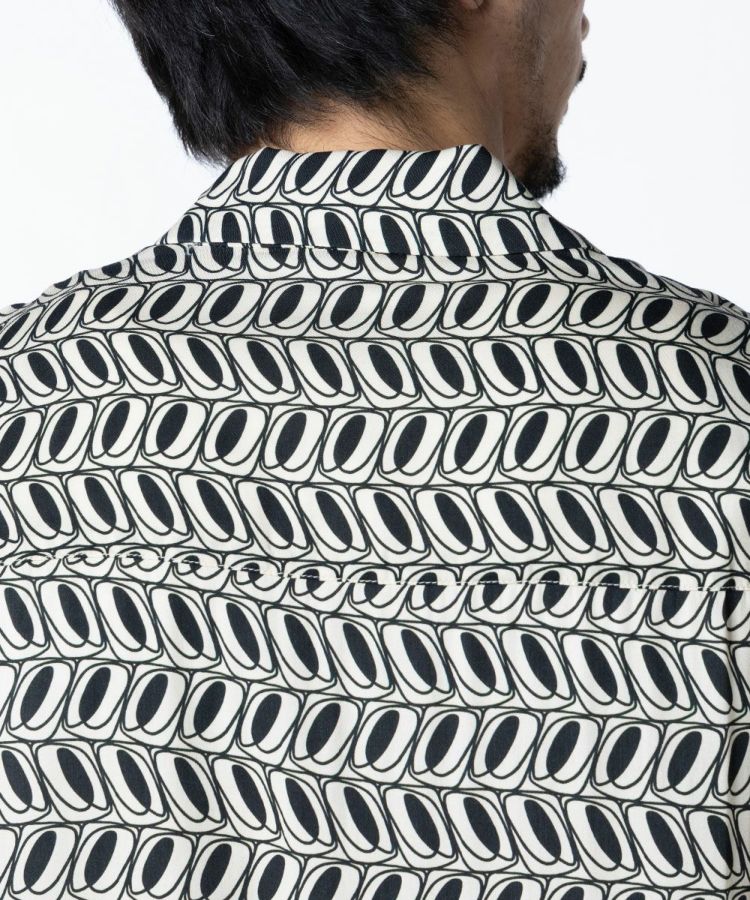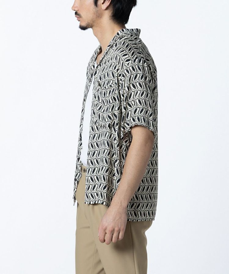 独特の模様が目を引く、オリジナルプリントを使用したシャツ。レーヨンのドレープ感と着用時の清涼感が気持ちいい一枚です。ゆったりとしたサイズ感で、リゾートシャツのようにリラックスした雰囲気で楽しめるのが魅力的。都会的にも合わせられるモダンな柄、柔らかくシックな印象を与えてくれるエクリュカラーもポイントです。