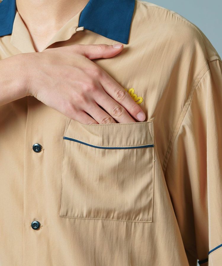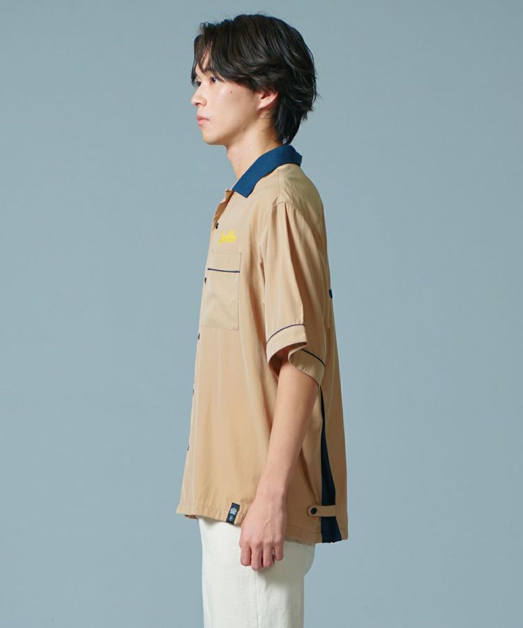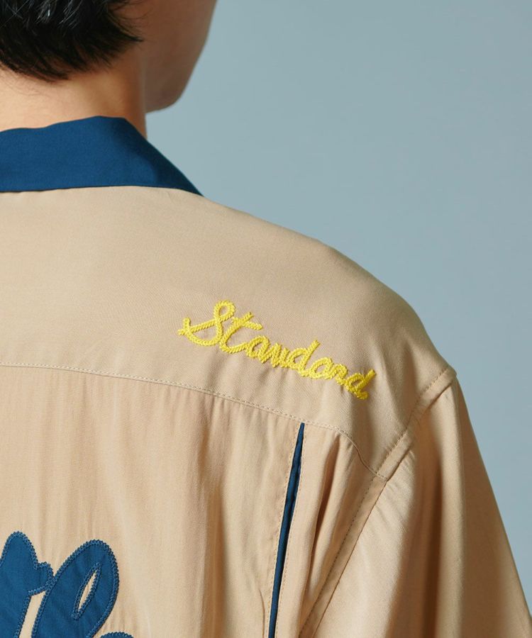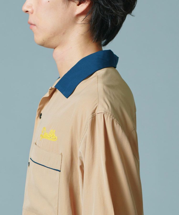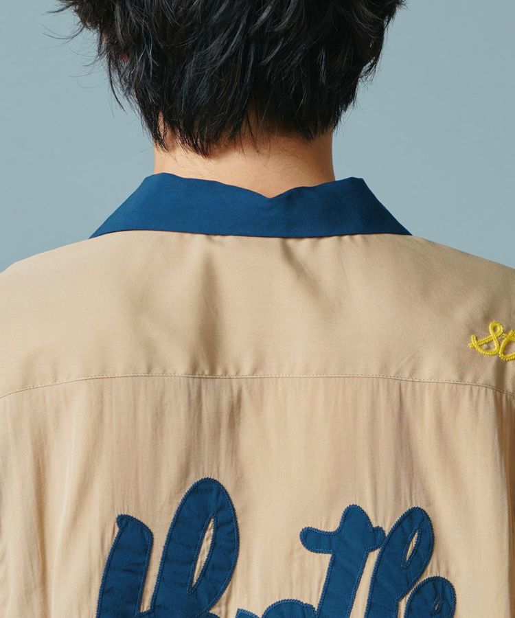 ポリエステルとレーヨンのMIX素材で仕上げた、なめらかな肌触りが心地良いボーリングシャツ。ボーリングシャツらしい落ち感とドレープがあり、オーバーサイズのリラクシンなムードが魅力です。バックにはインパクトたっぷりの刺繍をON。ベージュ、ネイビー、イエローの配色もセンス良く、これ一枚でこなれ感が出るアイテムです。