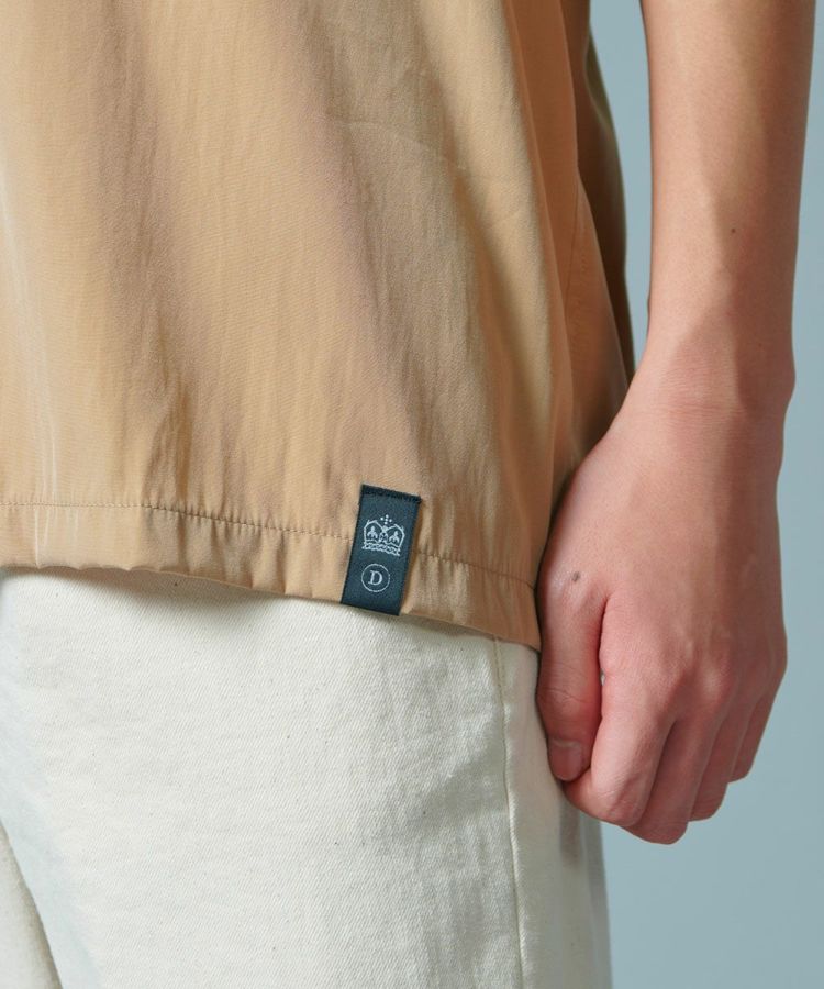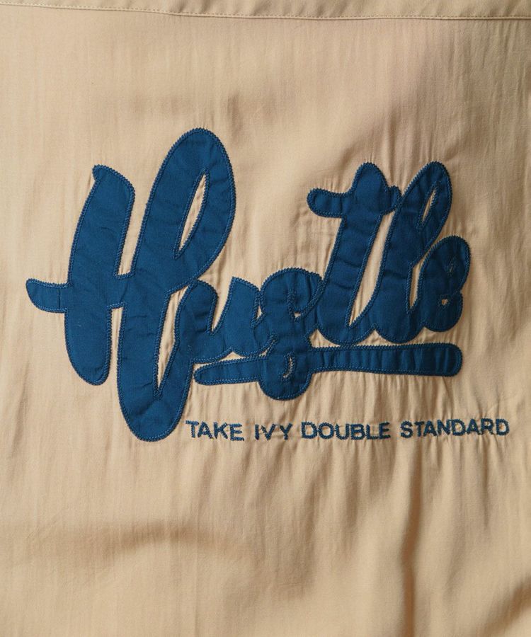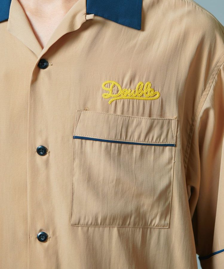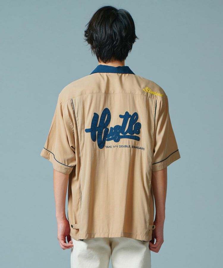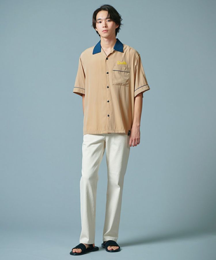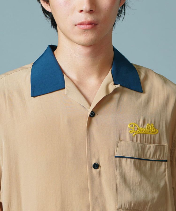 ポリエステルとレーヨンのMIX素材で仕上げた、なめらかな肌触りが心地良いボーリングシャツ。ボーリングシャツらしい落ち感とドレープがあり、オーバーサイズのリラクシンなムードが魅力です。バックにはインパクトたっぷりの刺繍をON。ベージュ、ネイビー、イエローの配色もセンス良く、これ一枚でこなれ感が出るアイテムです。