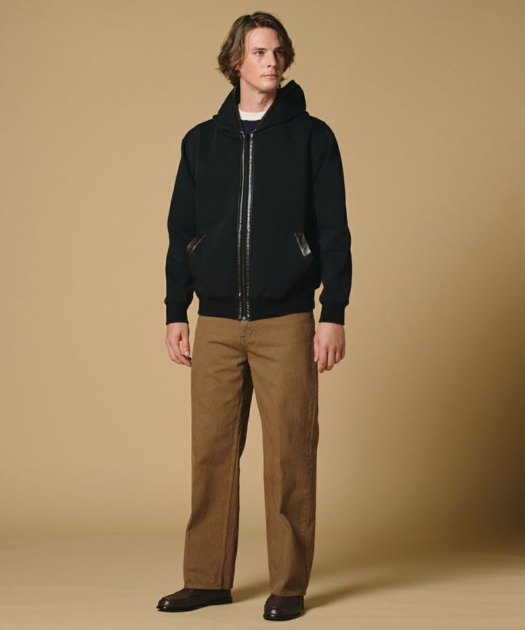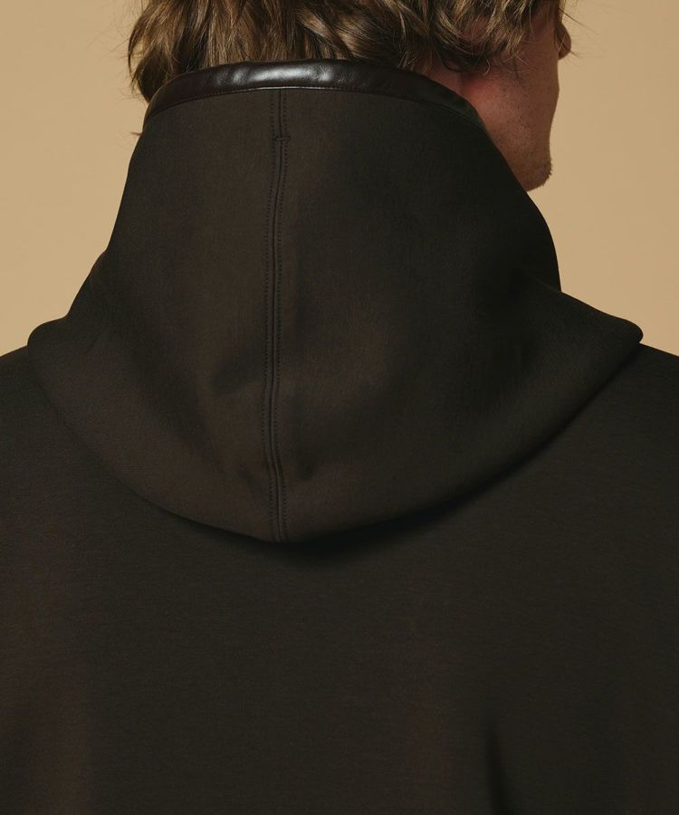程よい立体感と軽やかなエアリー感が魅力のストレッチダンボール素材を使用したジップパーカー。レザーパイピングを随所にあしらうことで、カジュアルになりすぎず上品な印象に仕上げました。袖口と裾まわりにはリブを施し、程よい抜け感をプラス。シンプルなTシャツやカットソーの上からサッと羽織るだけで、こなれた大人のスタイリングが完成します。