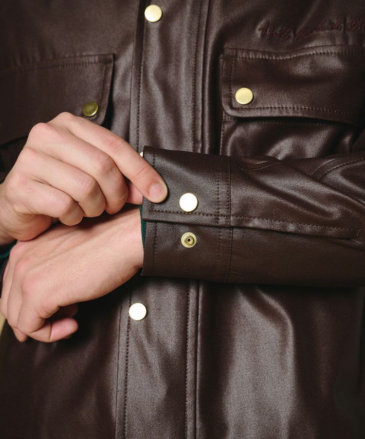 ヴィンテージライクな風合いが魅力の、レザー風ショートジャケット。特殊な加工技術を施し、本革さながらのツヤ感と高級感を備えた仕上がりを実現しました。軽量で扱いやすいポリエステル素材を採用しているため、お手入れがしやすく、気軽に取り入れられるのもポイント。季節の変わり目や肌寒い日にも重宝する、着回し力抜群の一着です。