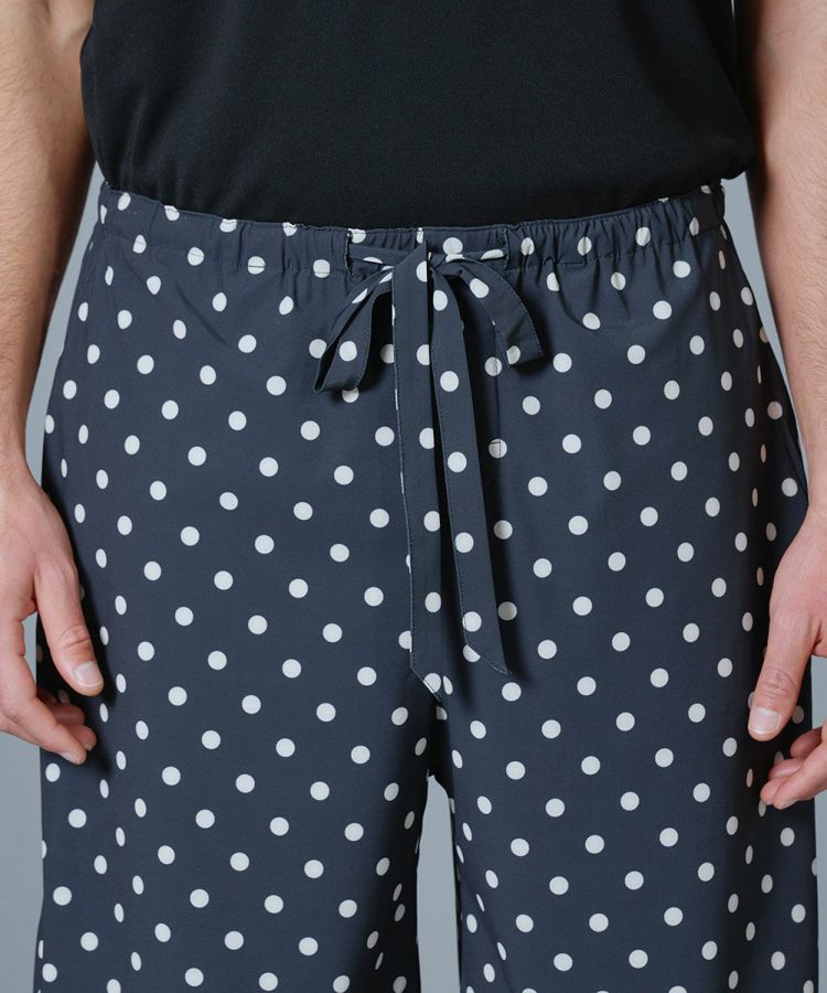 ドット柄が目を惹く、デザイン性に優れたハーフパンツ。ポリエステルトリコットン素材にプリントを施し、接触冷感や吸水速乾といった機能性が高い点も魅力的です。トップスをタックインすれば、ウエストのリボンがさりげないアクセントになって、きれいめな印象に。同素材のシャツ(型番:0704050253)と合わせると、爽やかな夏のセットアップコーデが完成します。