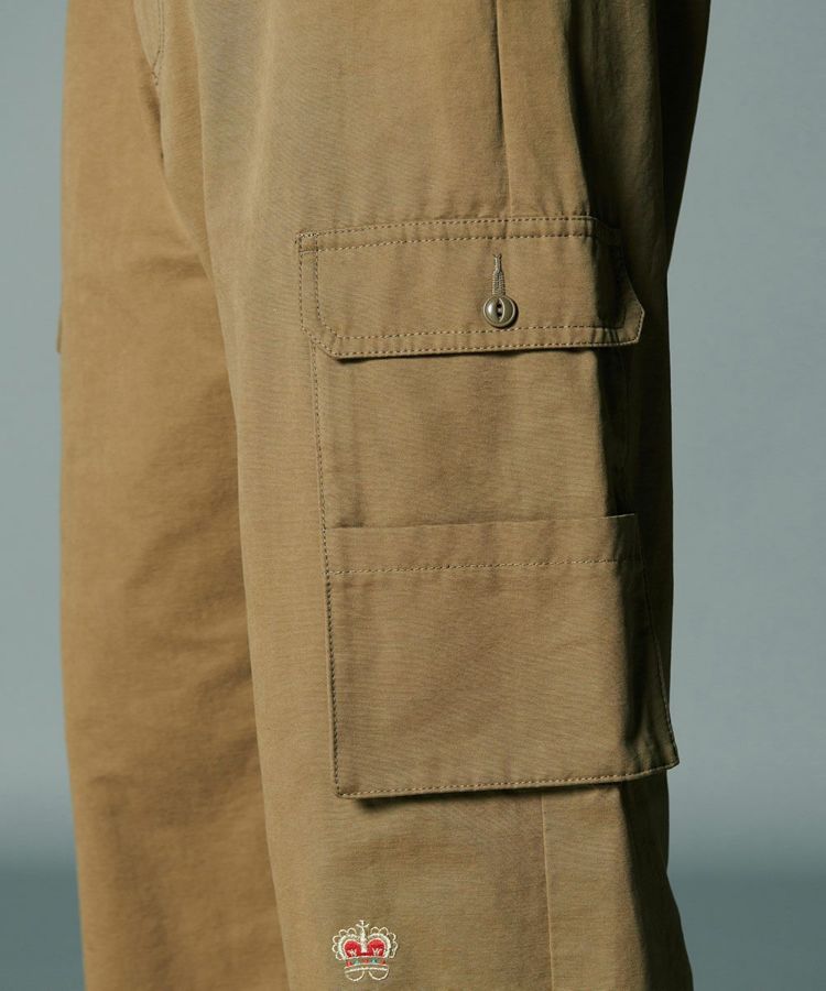今季らしい着こなしにぴったりな、ボリューム感のあるカーゴパンツ。コットン、ポリエステル、ナイロンを組み合わせたナチュラルな風合いのグログラン素材に後加工で独特のぬめり感を出し、さりげないアクセントにしました。程よいハリ感が無骨なカーゴパンツと絶妙にマッチし、大人っぽく穿きこなせる一本。ポリエステル混でシワになりにくく、軽い穿き心地なのもうれしいポイントです。