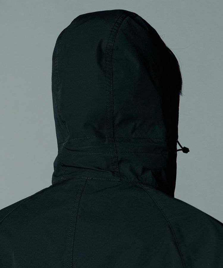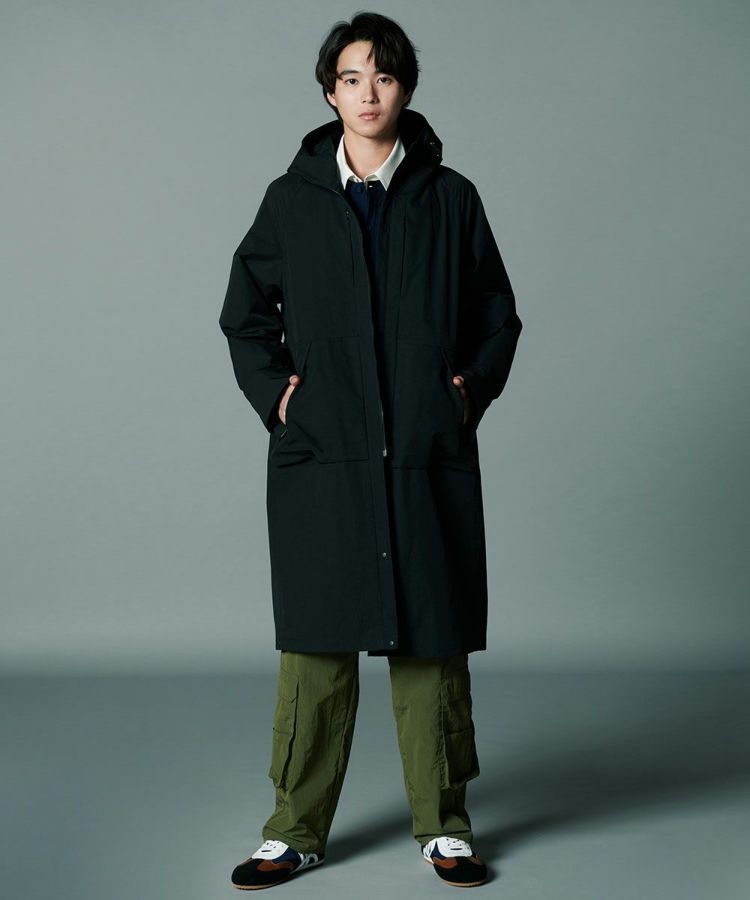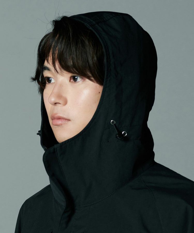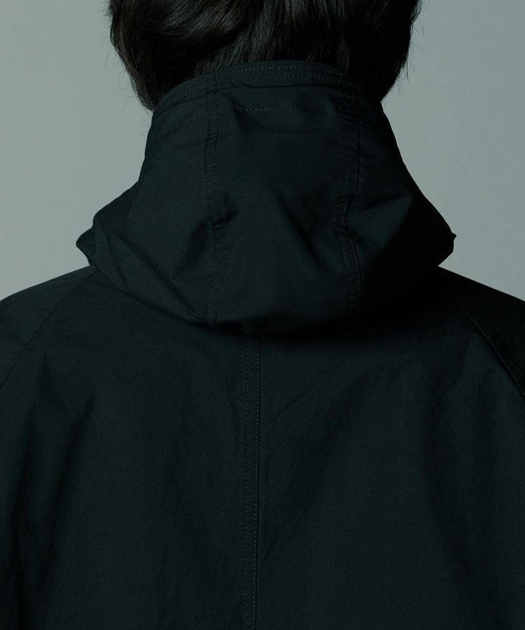 コットンのようなナチュラルな風合いのある、ポリエステル素材を使用したモッズコート。環境に配慮したCO撥水加工を施し、機能性と高密度による上質なハリ感を実現しました。程よい形状記憶効果があるため、カジュアルなデザインでありながらもパリッとした雰囲気で着用できるのが魅力。ブラックで統一したミニマムさもポイントです。