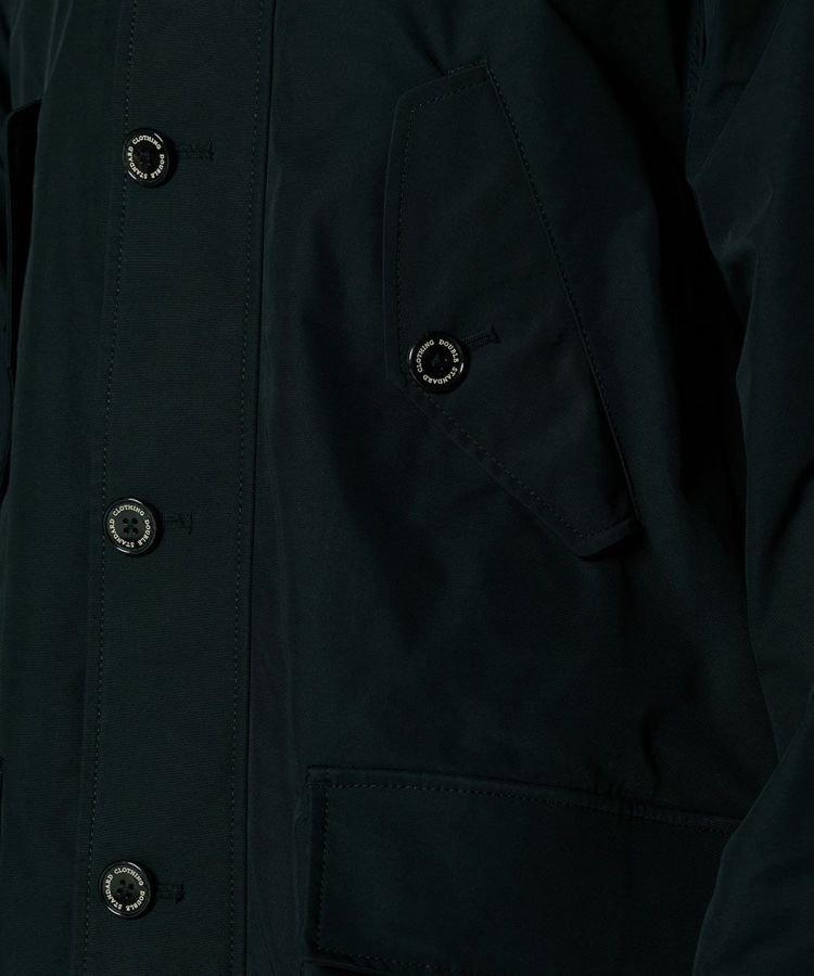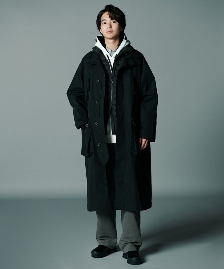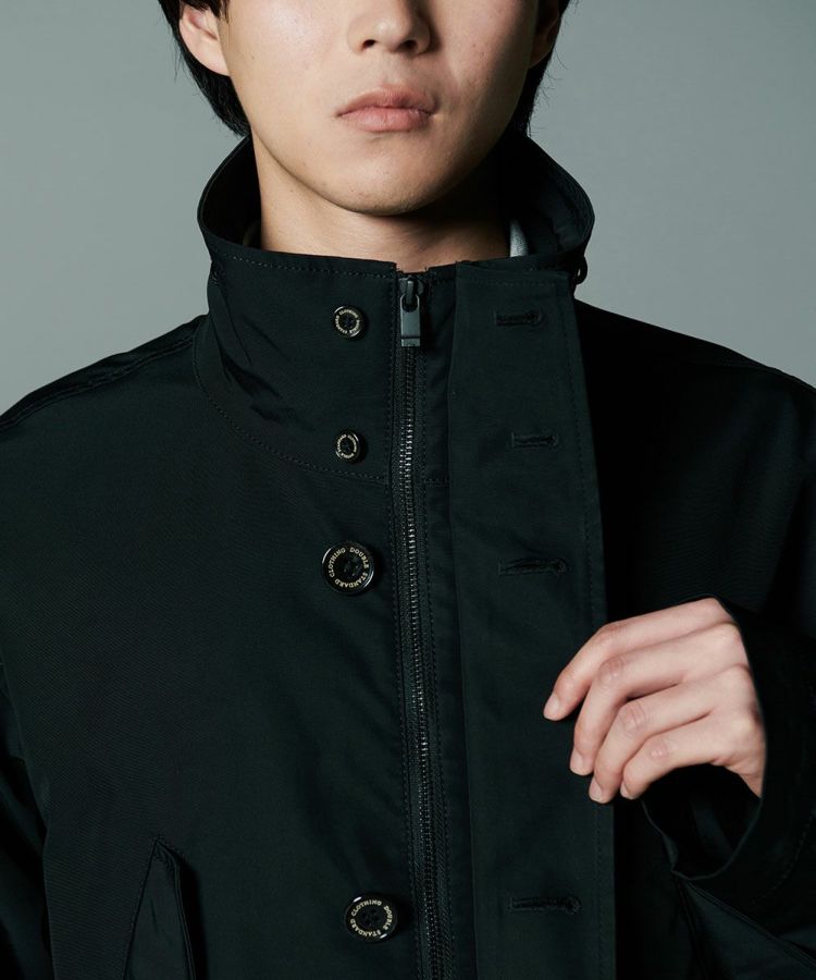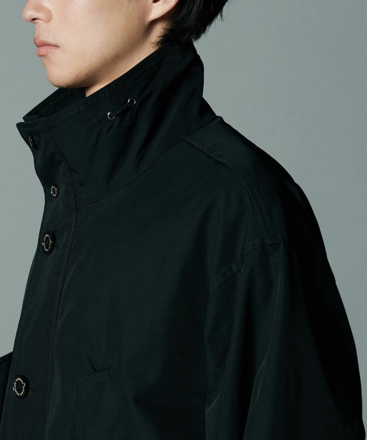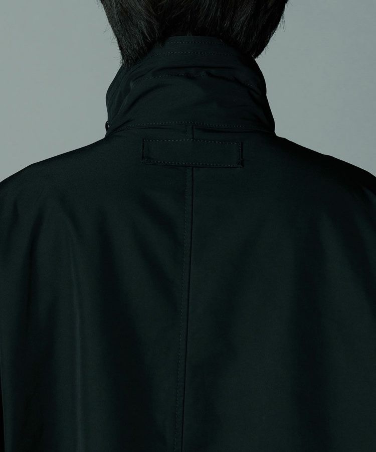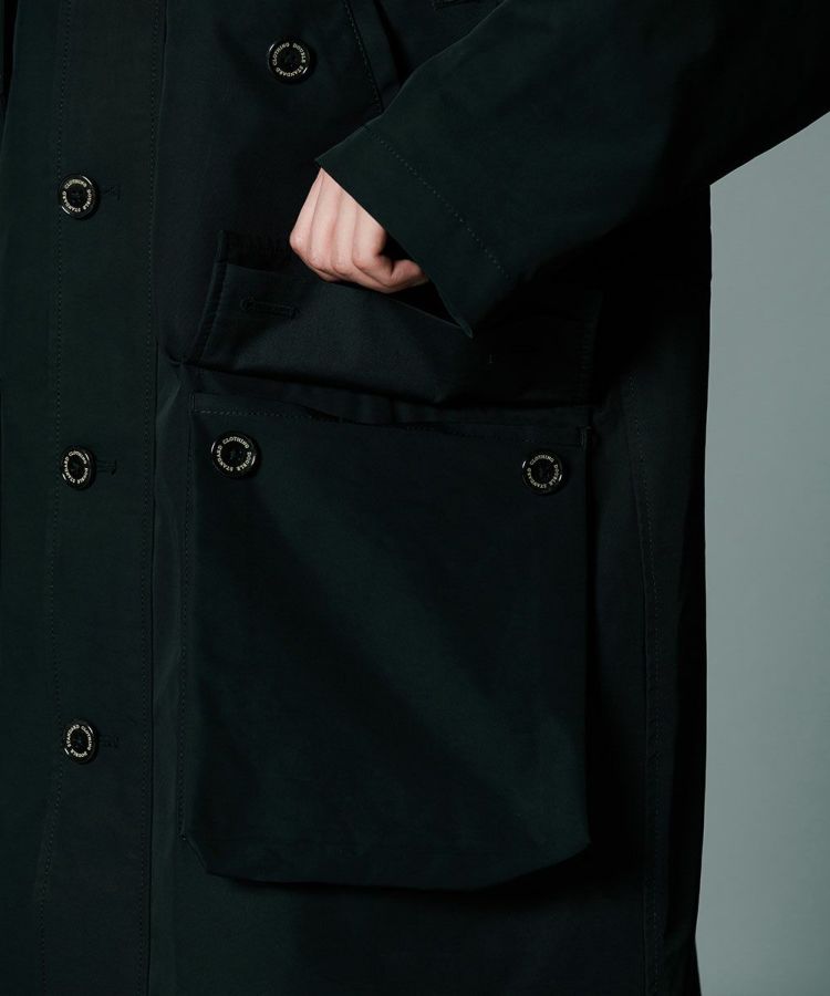 コットンのようなナチュラルな風合いのある、ポリエステル素材を使用したロングコート。環境に配慮したCO撥水加工を施し、機能性と高密度による上質なハリ感を実現しました。程よい形状記憶効果があるため、パリッとした雰囲気で着用できるのが魅力。都会的でスタイリッシュな佇まいを叶えてくれる、クラシカルなミリタリーコートです。
