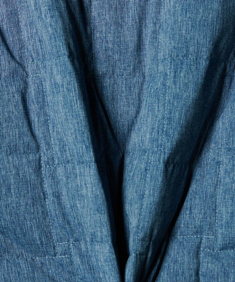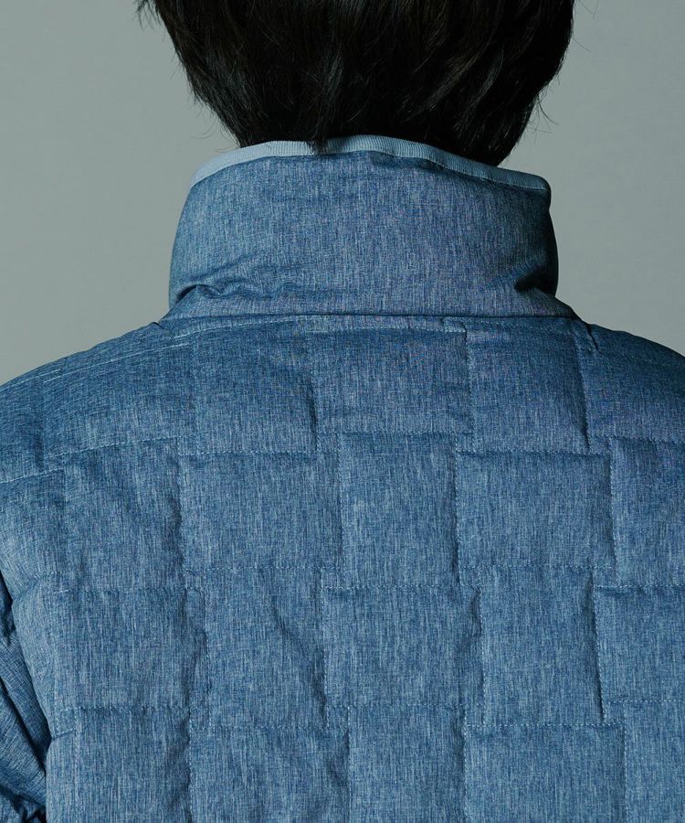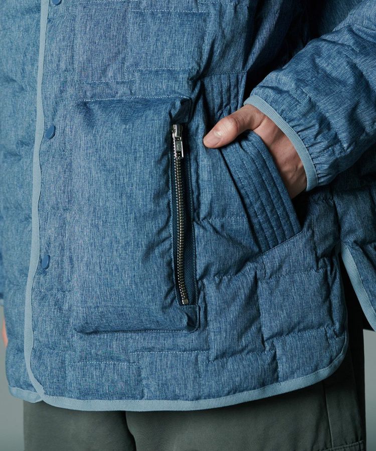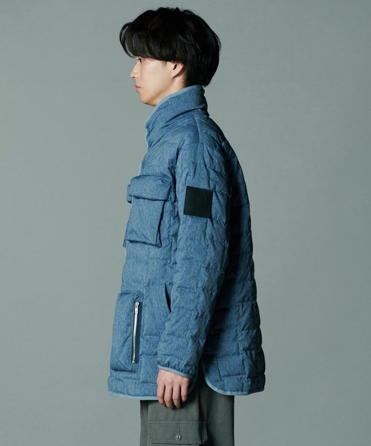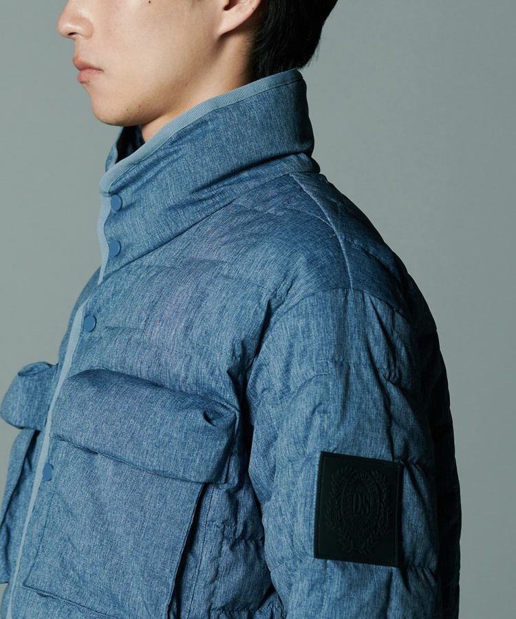 デニムのように見えるプリントを施したダウンジャケット。シルキーなシャンブレータフタ素材を使用し、スポーティーでありながら大人っぽく仕上げました。イントレチャートのテクニックで、他にはないデザイン性を高めているのもD/himらしいポイント。ダウン高混率で、非常に軽やかでありながら暖かいのも魅力です。