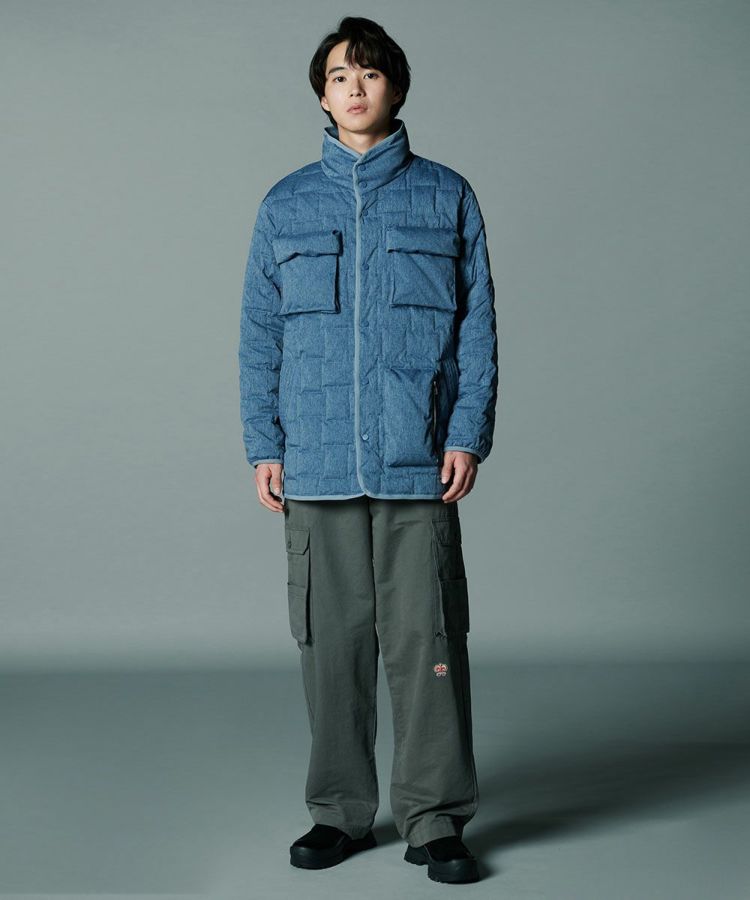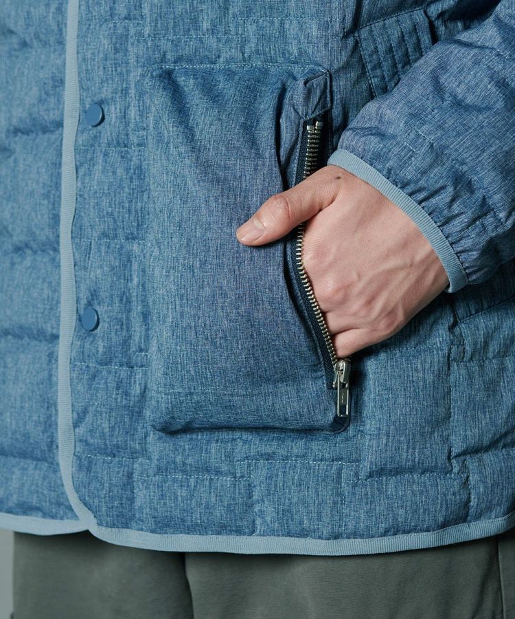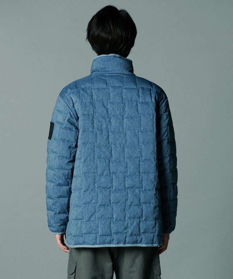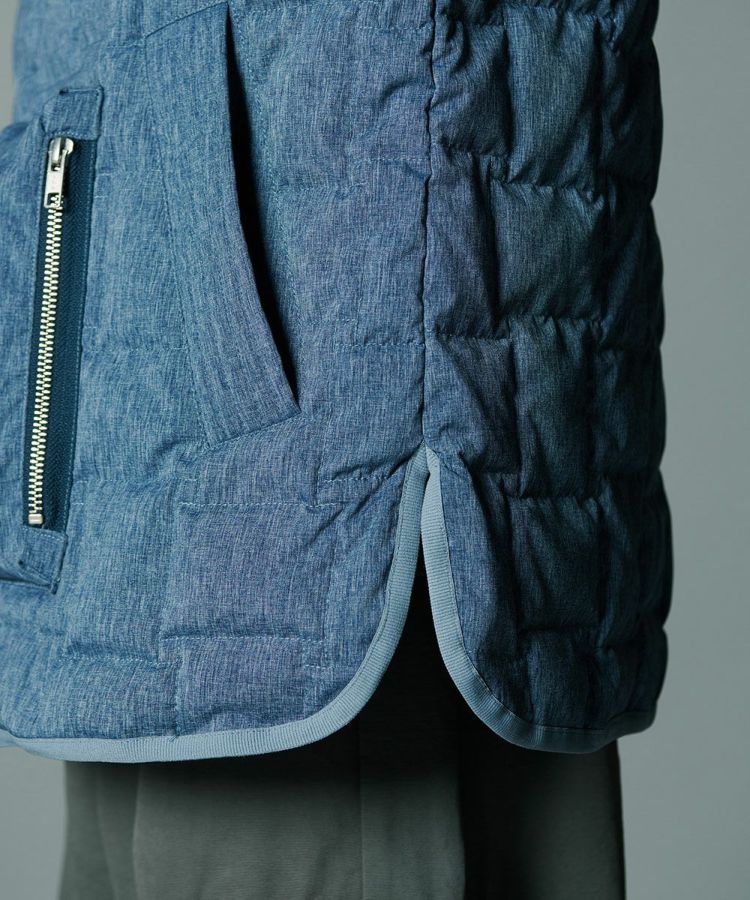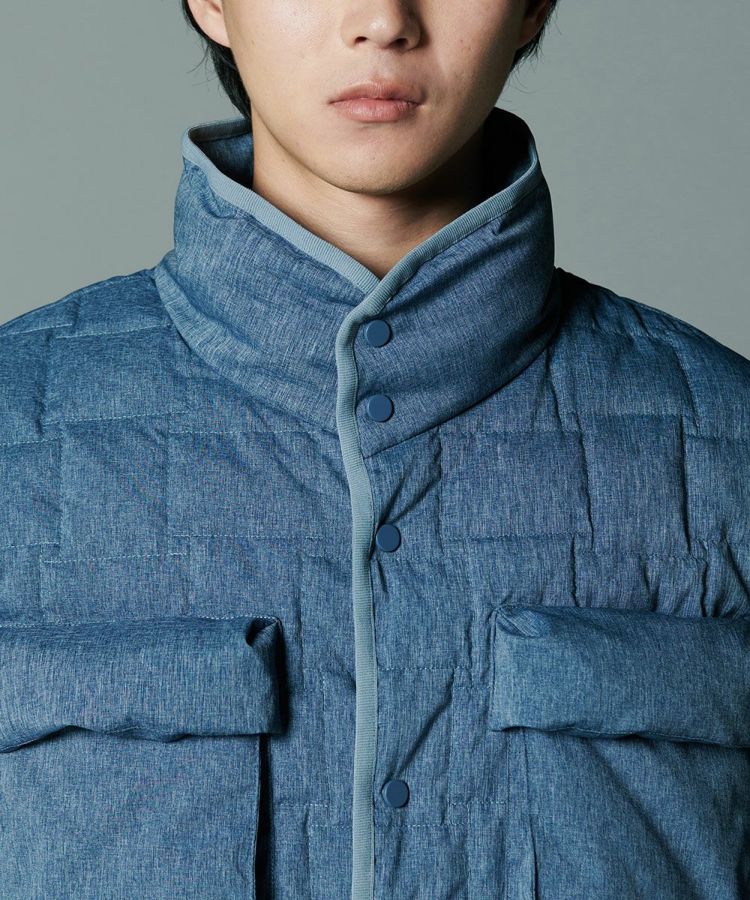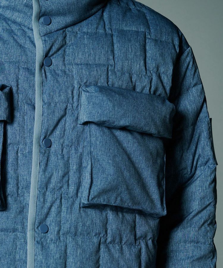 デニムのように見えるプリントを施したダウンジャケット。シルキーなシャンブレータフタ素材を使用し、スポーティーでありながら大人っぽく仕上げました。イントレチャートのテクニックで、他にはないデザイン性を高めているのもD/himらしいポイント。ダウン高混率で、非常に軽やかでありながら暖かいのも魅力です。