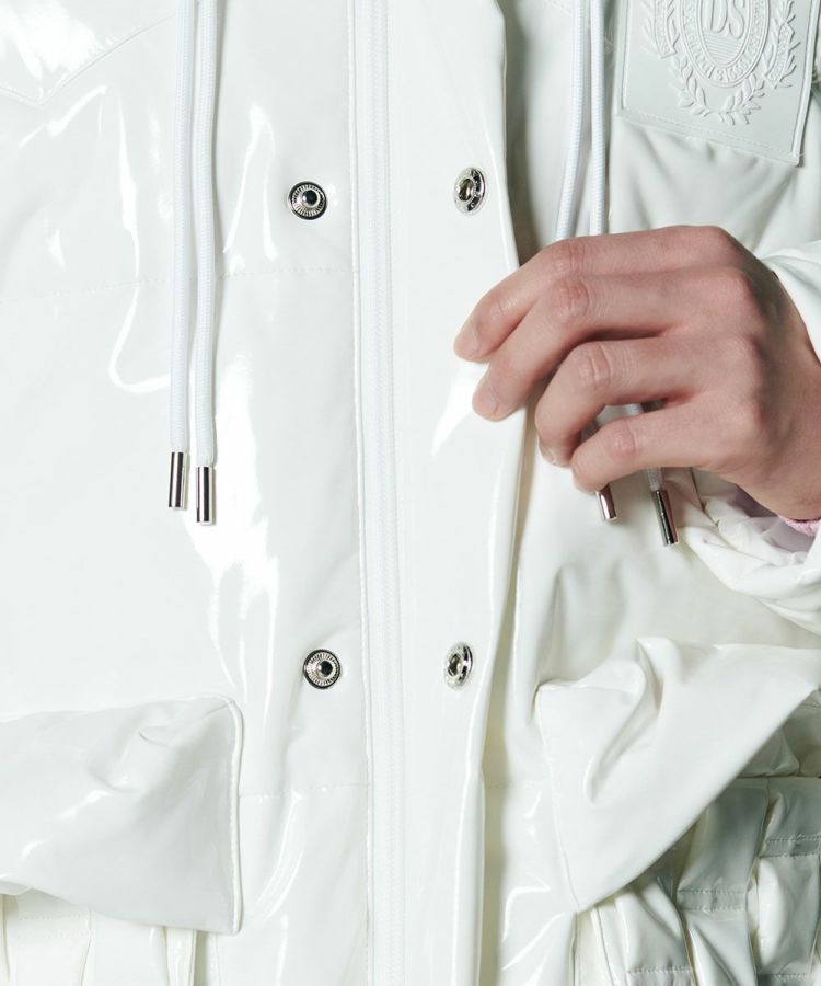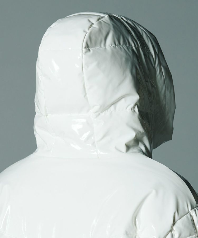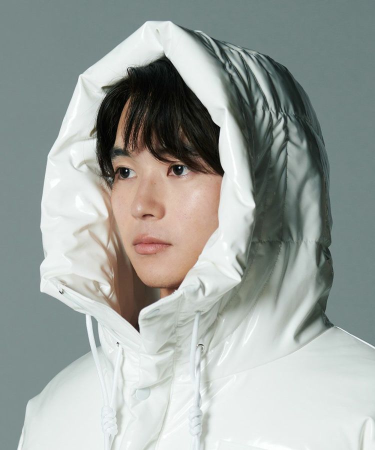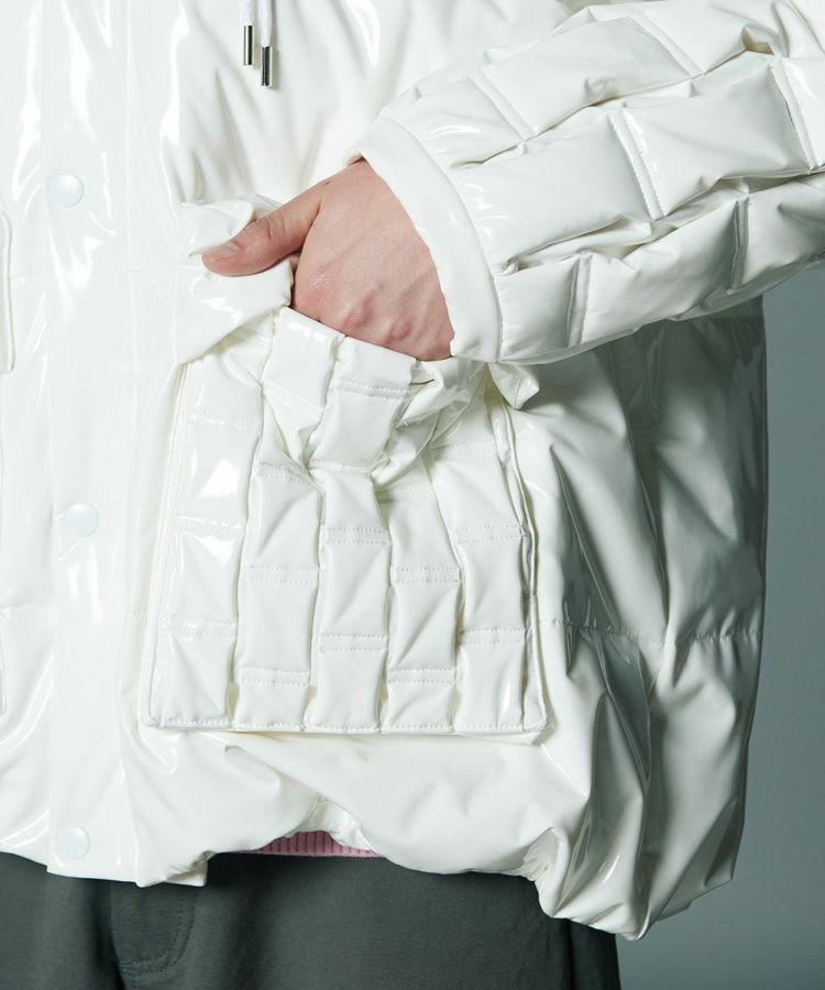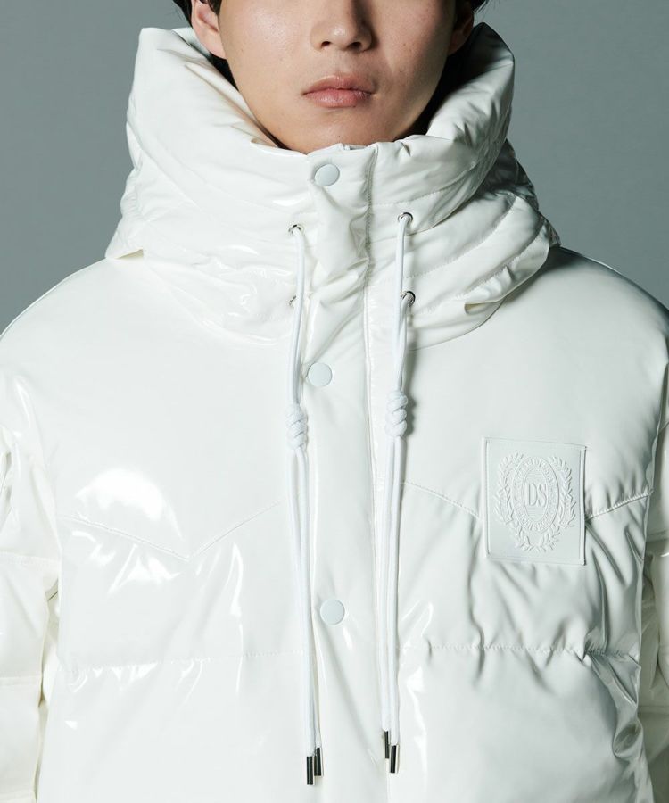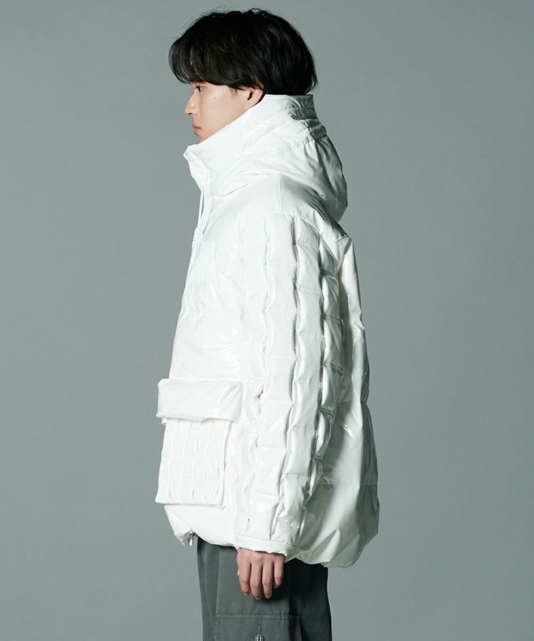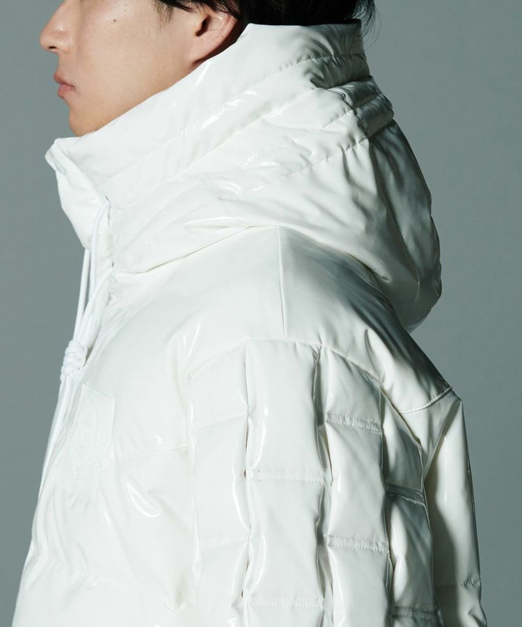エナメル合皮の光沢感がハードな印象を与えるダウンジャケット。いつものカジュアルコーデにプラスするだけでワイルドなエッセンスをプラスできる一着です。イントレチャートのテクニックでデザイン性を高めているのがD/himらしいポイント。ダウン高混率で、非常に軽量でありながら暖かいのも魅力になっています。