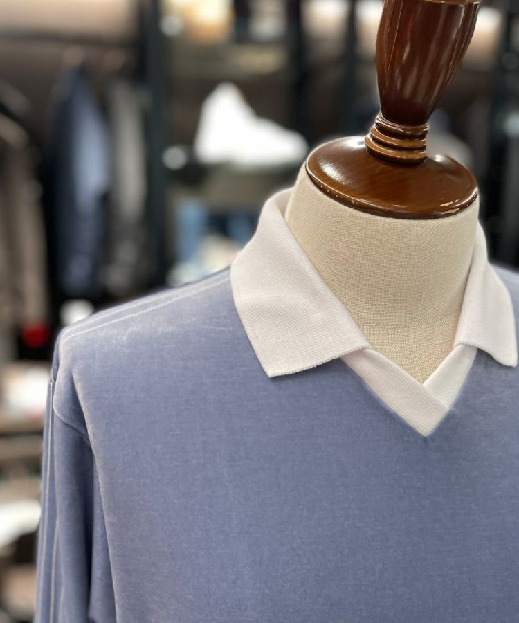 高級感のあるベロア素材を使用したロングスリーブポロシャツ。トリアセテートを使用し、シンカーパイルで編んでベロア仕上げする事で上品な光沢感と柔らかさ、伸縮性が特徴です。左胸にはワンポイント刺繍、配色の襟や袖口には編立リブを使用し、ステッチはチェーンステッチの手法を用いることで、ベロアの毛足に埋もれない白いステッチのラインが程よい軽さを演出しています。