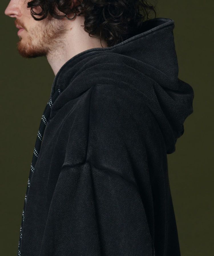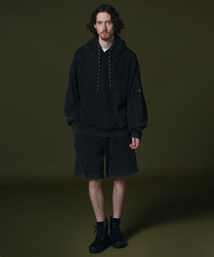 30/10の裏毛を顔料で染色し、ケミカルウォッシュ加工を施したパーカー。ハードな加工により縦横にかなりの縮みが発生し、他にはないユニークなボリューム感があります。着用するとしっかり暖かく、オーバーサイズが全身のコーディネートにメリハリを付けてくれるのも魅力。また、オリジナルのサークルロゴと極太のスピンドルがアクセントになっています。同素材のショートパンツ(型番:0706111244)とセットアップで楽しむのもおすすめ。