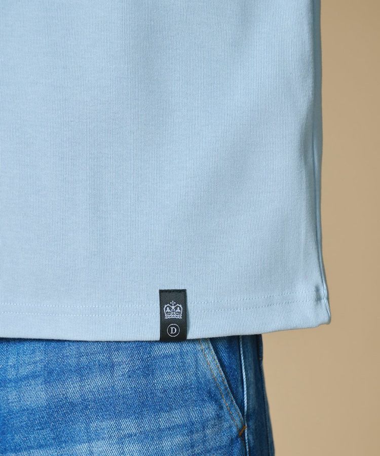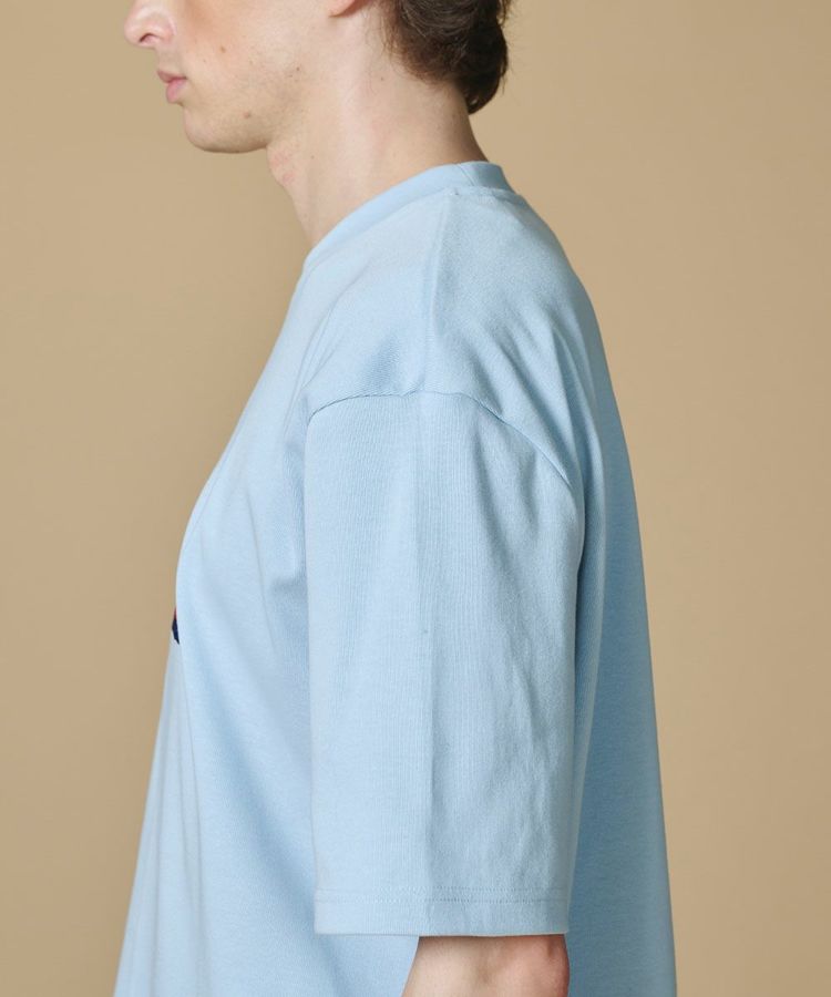 トレンド感のあるショート丈に、ヴィンテージライクなロゴをあしらったTシャツ。糸設計と編み技術にこだわり、強撚糸ながら斜行を抑えたオリジナル素材を使用しました。さらに特殊シルケット加工を施すことで、ほどよいハリ感と毛羽のないクリアな表情を実現。ベーシックで着回しやすいオフホワイトと、爽やかな印象のサックスブルーの2色展開で、デイリーに活躍する一着です。