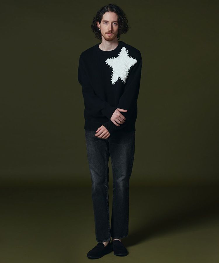 大きなスターモチーフが目を引くニットトップス。インターシャ編みらしい大胆でキャッチーなスターの上から、さらに手差し刺繍を施し凝った作りに仕上げました。ゆったりとしたリラクシンなサイズ感もポイントで、デニムやスラックスに合わせれば、遊び心のある大人カジュアルスタイルが完成します。