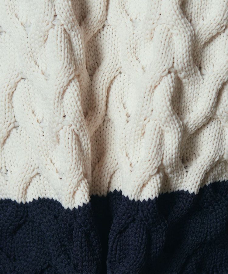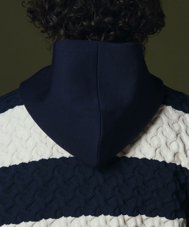 オリジナルのケーブル編みによる、ポコポコとした立体感がインパクトたっぷりのパーカー。袖やフード部分は通常編みですっきりと仕上げ、メリハリのあるシルエットに仕上げました。太めのボーダー柄がカジュアルながらも、ドライタッチな質感できれいめに着られるのが魅力です。