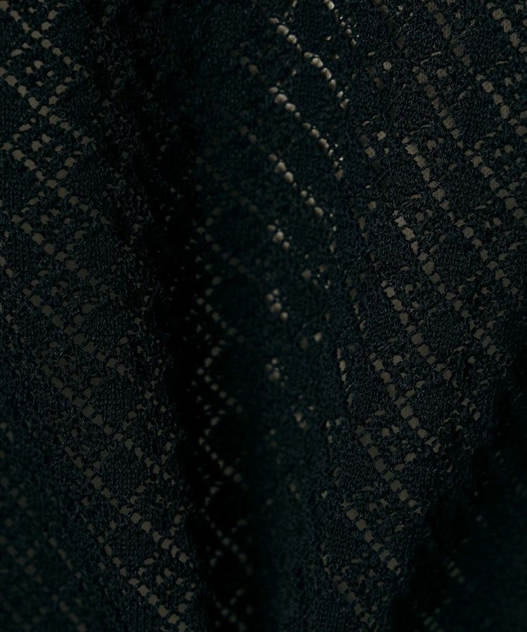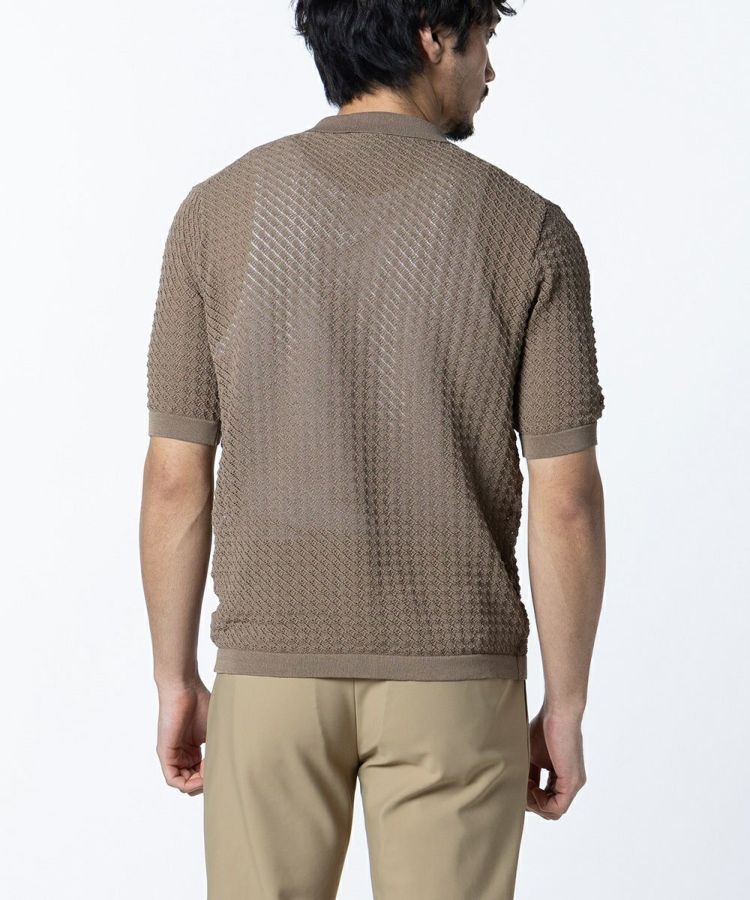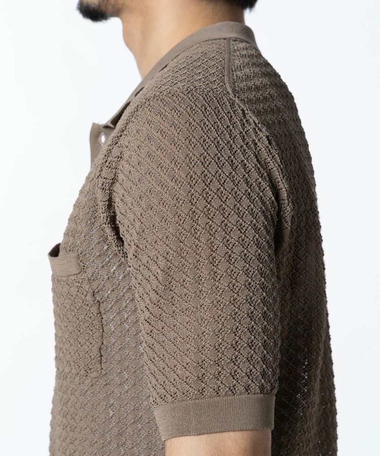 シアーな生地が涼しげな、メッシュニットシャツ。透かし模様でもしっかりとした仕立てに見えるよう、肌触りの良いコットンポリエステルの混紡素材を使用しています。総針編みをベースにした、凝った作りのアイテム。柔らかなニット生地がポイントで、リブを太めに取り身体に程よくフィットするシルエットに仕上げています。
