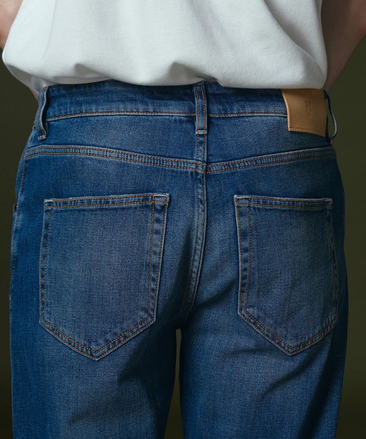 穿き込んだような絶妙な色合い、リペアのディテールが特徴になったデニムパンツ。ステッチもほのかなアクセントになっています。ヴィンテージのような風合いがありながらも、すっきりとしたシルエットやコンパクトな腰まわりのフォルムで、スタイリッシュに穿きこなせる一本。マットな質感で作ったブラウンカラーのパッチもモダンな印象で、品よくコーディネートできるのが魅力です。