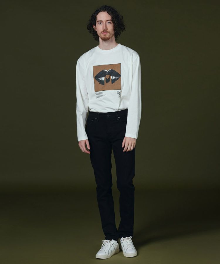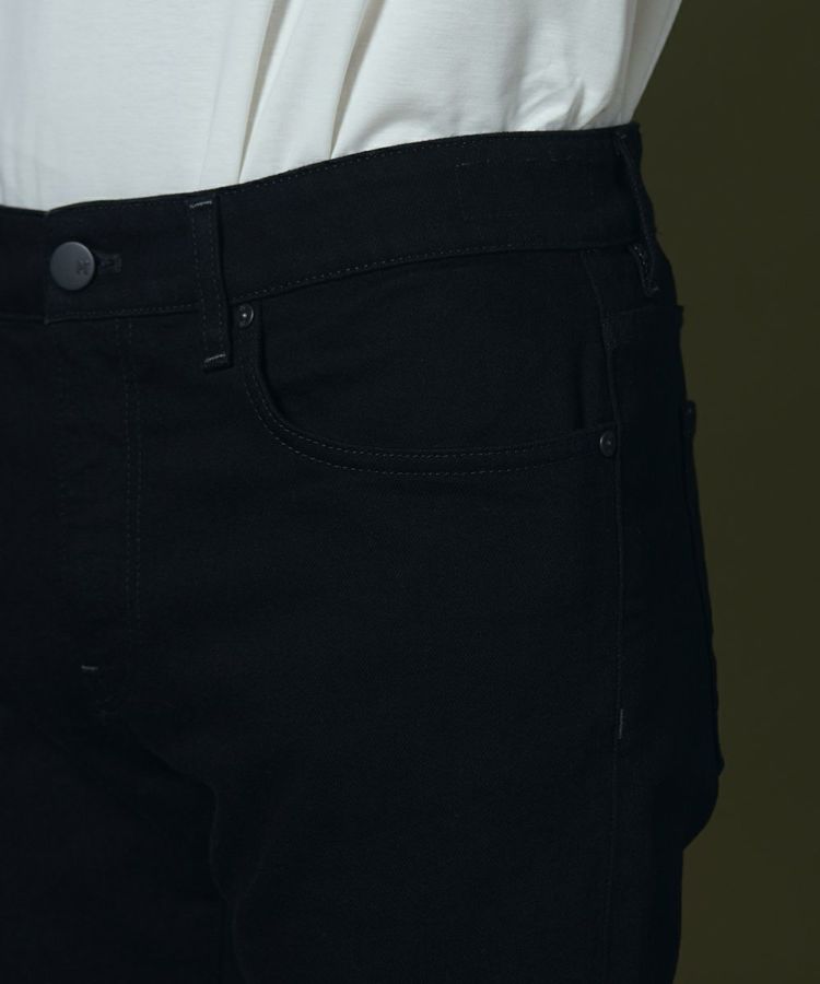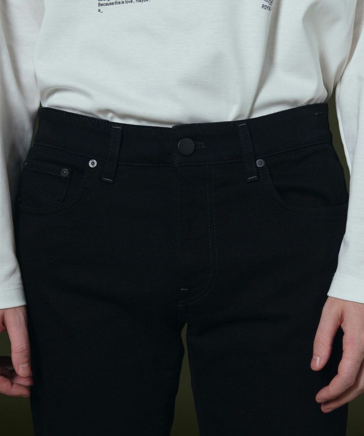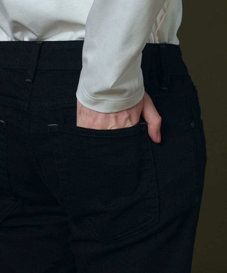 モードな佇まいを実現する、ミニマムなデザインのブラックデニム。ボタンやパッチもブラックに統一しマットな質感にすることで、よりスタイリッシュなムードに仕上げました。すっきりとした細身のストレートシルエットで、どんなトップスを合わせてもクールに決まる一本。季節を問わず通年使えるので、ワードローブに加えておきたいアイテムです。