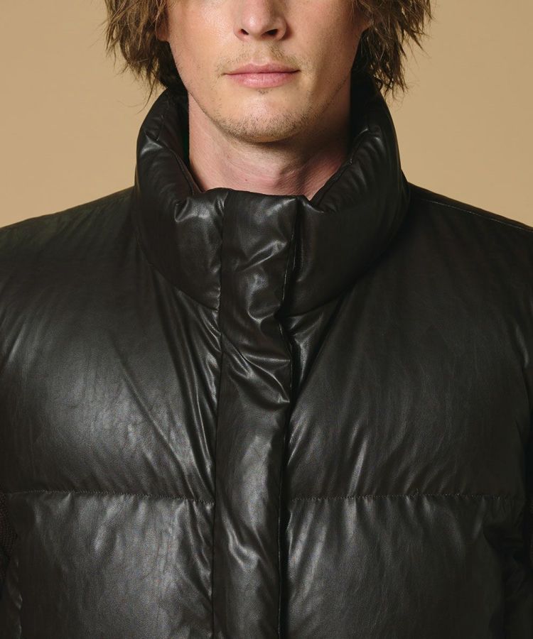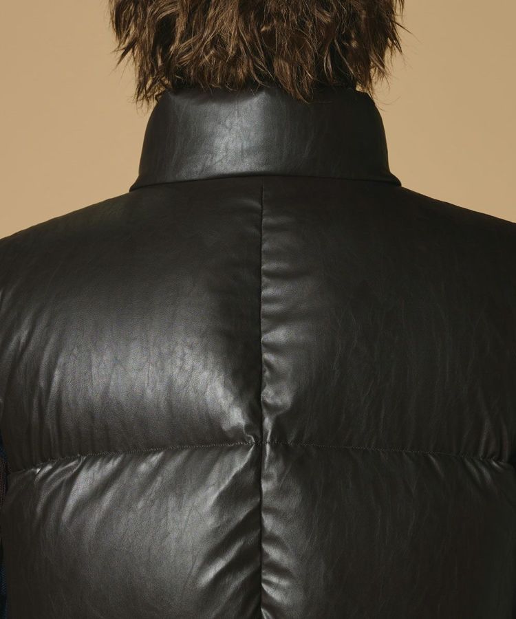 ヴィンテージライクな風合いが魅力のフェイクレザーを使用したダウンベスト。中綿にはたっぷりとフェザーを詰め込み、優れた保温性を実現しました。ボリュームのあるデザインながらも、クロップド丈のコンパクトなシルエットで、カジュアルすぎずきれいめな印象に。スラックスやワイドパンツなどのボトムスとも好バランスで、こなれ感のあるスタイリングが楽しめます。