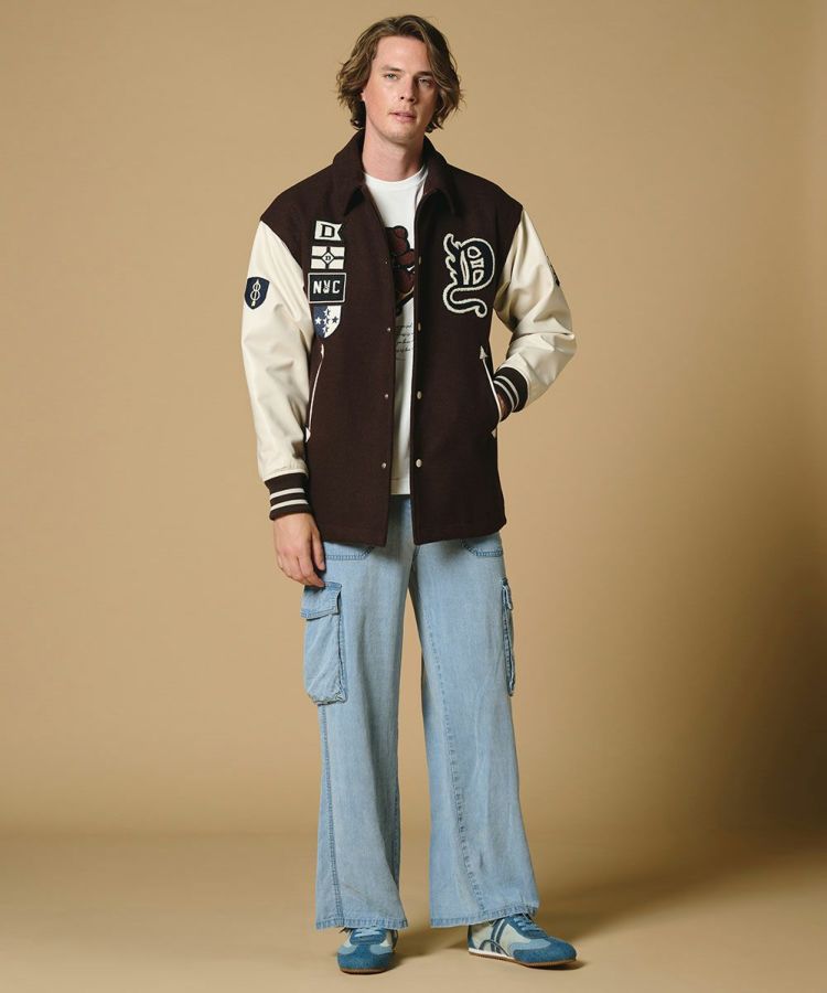 オリジナルワッペンを贅沢にあしらった、存在感抜群のスカジャン。フロントには保温性に優れたウール混素材を使用し、肌寒い季節でも暖かく快適に着用できます。袖部分には通気性に優れたシープスキンを採用し、レザーの上質感と機能性を兼ね備えた仕上がりに。デザイン性と実用性のどちらも妥協しない、今季の主役アウターとしておすすめの一着です。