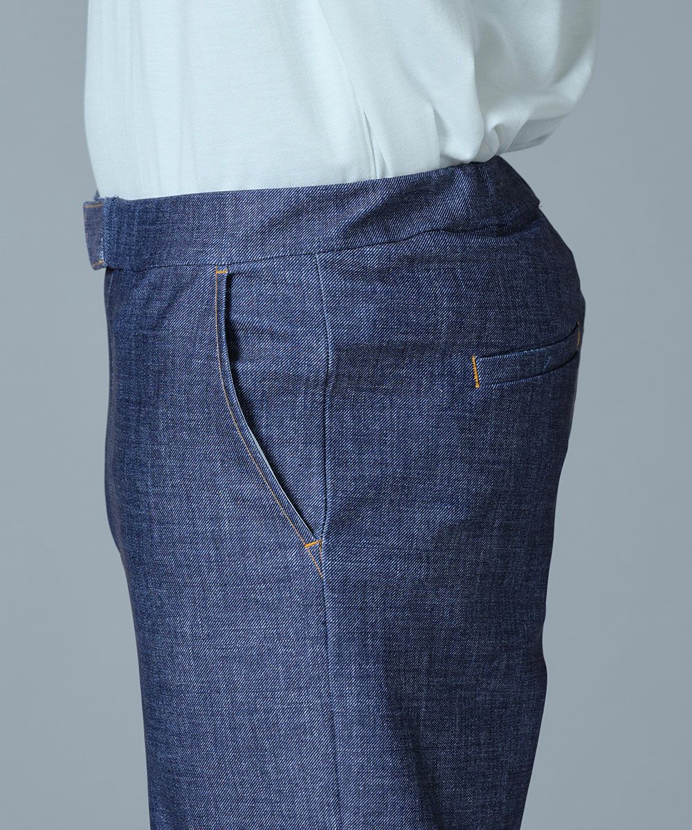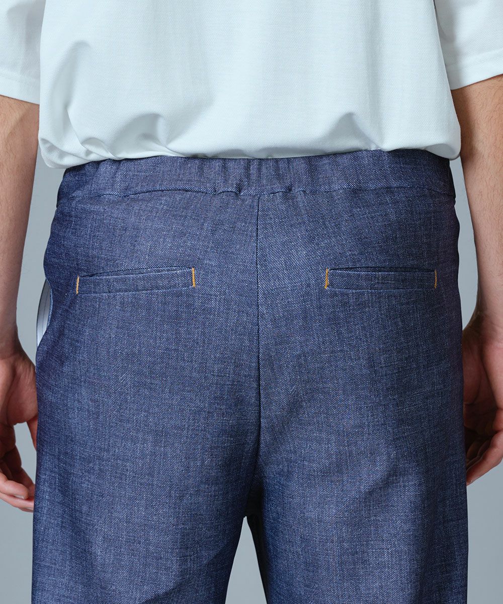 リアルなデニム柄を転写プリントしたデザイン性が高いパンツ。程よい伸縮性と柔らかさを兼ね備えたトリコット素材を採用し、機能面にも配慮しました。カラーは爽やかなサックスとシックなインディゴの2色で展開。同素材のTシャツ(型番:0708070253)と合わせれば、一味違うデニムセットアップコーデを楽しめます。
