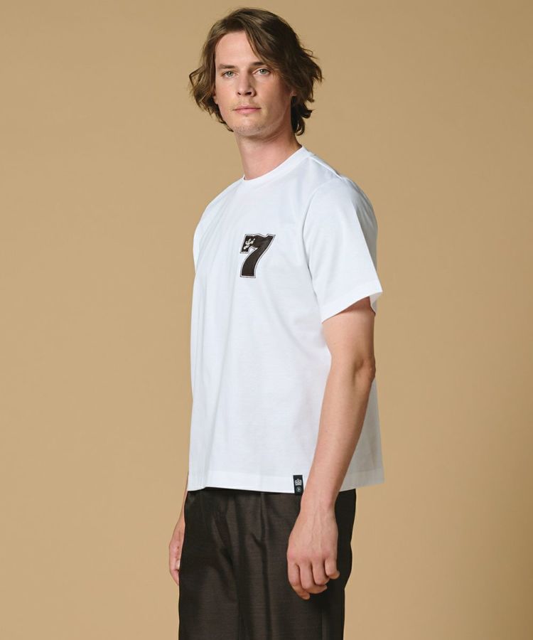 高級原綿スーピマコットンをハイゲージで編み上げ、シャープな印象に仕上げたTシャツ。上品な光沢とコットンならではの優しいタッチを活かし、柔らかい肌触りに仕上げました。胸元には「7」のワンポイントを合皮素材であしらい、シンプルながらもデザイン性のある一枚に。洗練されたベーシックアイテムは、持っておくと便利なアイテムです。