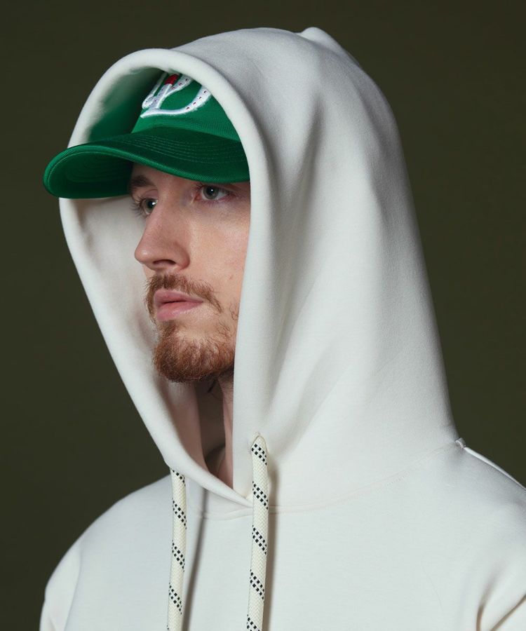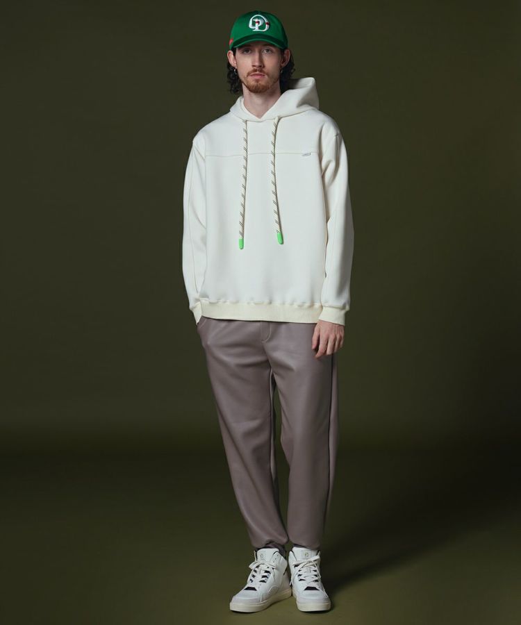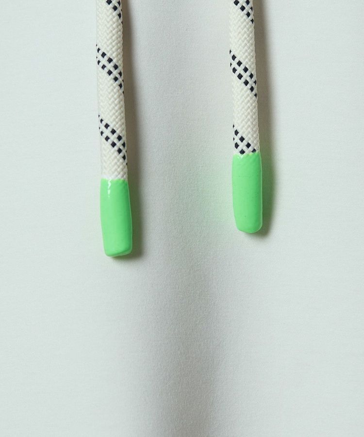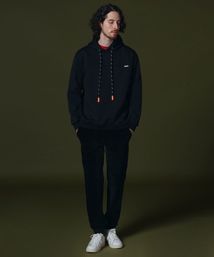 定番人気のダンボール素材を使用したパーカー。スポンジを挟み込んだような独特の膨らみ感が特徴です。しっかりとボリュームがありつつ軽量なのもポイント。ストレスフリーで、ユニセックスに着られます。ハリ感ときれいな表面感があるため、カジュアルでありながらも上品なのも魅力的。バックの立体的なプリントや、蛍光ディップをあしらったスピンドルがアクセントになっています。