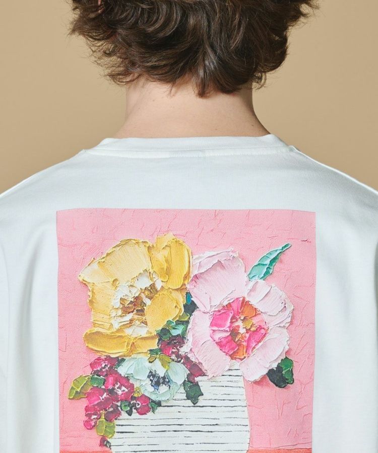 バックにあしらったフラワーモチーフのプリントが華やかなTシャツ。高品質なコットンを引き揃えて丁寧に編み立て、さらにシルケットバイオ加工を施して自然な光沢と上品なハリ感を引き出しました。特殊機によるインクジェットプリントを厚盛で組み合わせ、鮮やかな発色を実現。デイリーに取り入れやすく、着回し力の高い一枚です。
