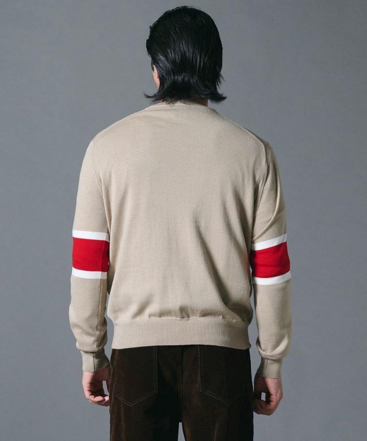 なめらかでソフトな肌触りが魅力の、エキストラファインメリノ梳毛を使用したシンプルなニット。ベージュを基調としたボディに赤のラインがアクセントとなり、スタイリッシュな雰囲気を添えました。薄手で軽やかな仕立ては、秋冬シーズンのレイヤードスタイルに最適。オン・オフを問わず幅広いコーディネートで活躍する一枚です。