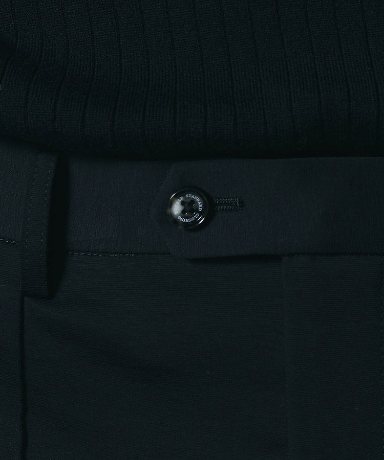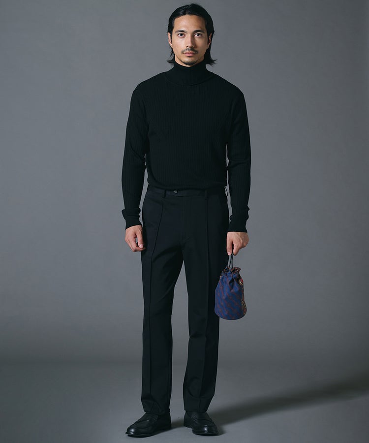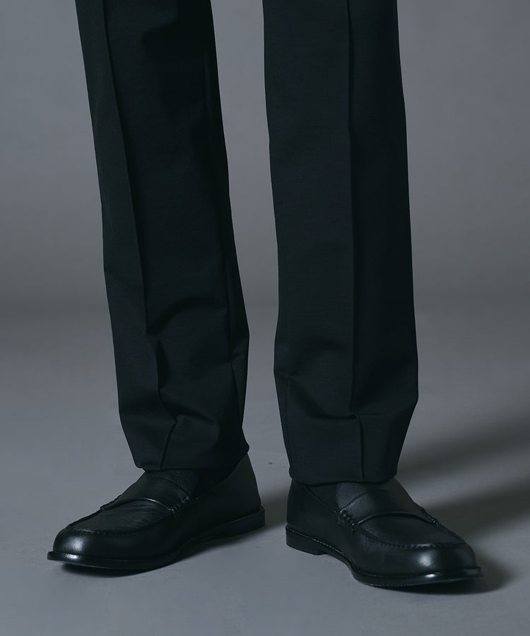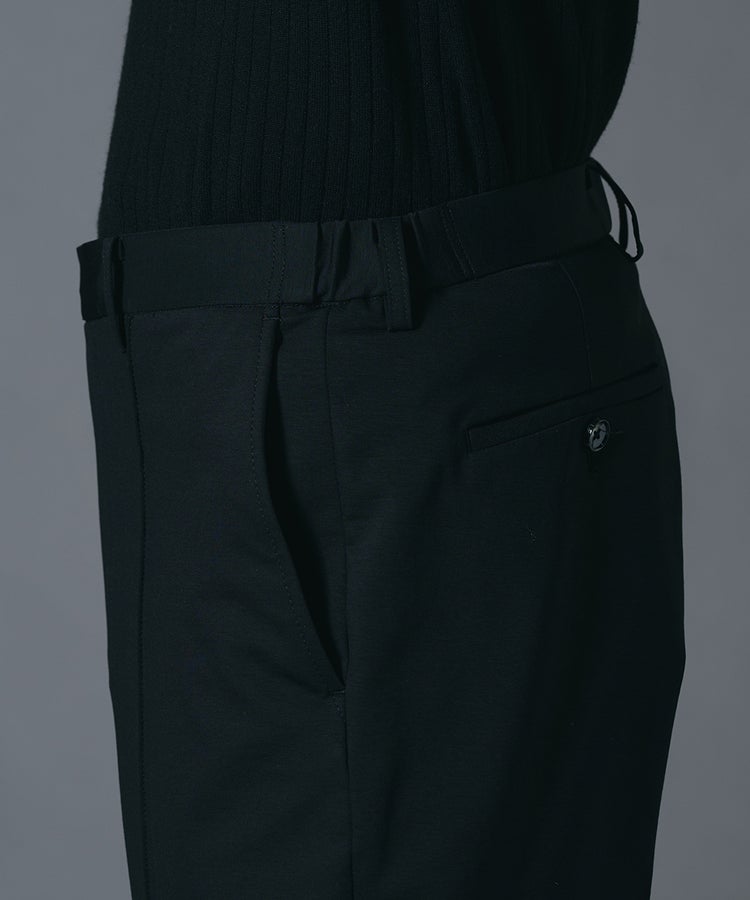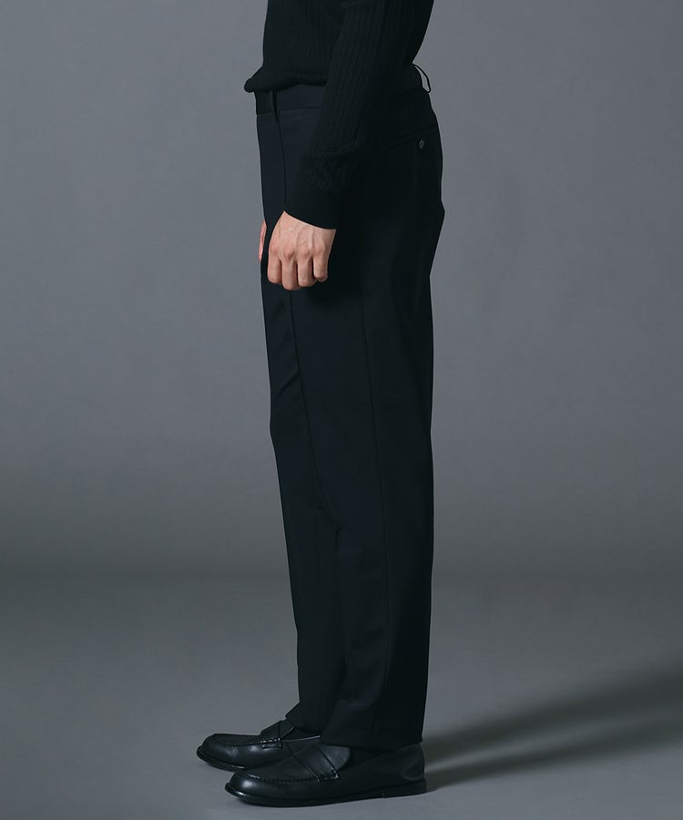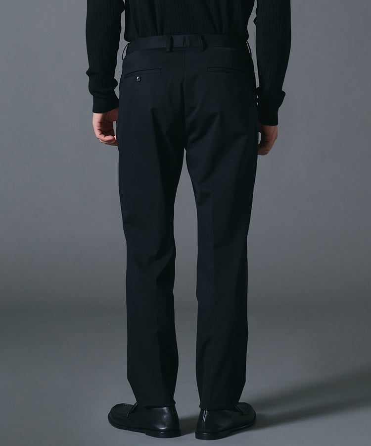 高いストレッチ性を備え、動きやすさに配慮したスラックス。上品な光沢が際立つナイロンポンチ素材を使用し、ラフになりすぎないきれいめな印象に仕上げました。裾に向かって緩やかに細くなるテーパードシルエットが脚のラインをすっきりと見せ、バランスの取れたスタイリングを叶えます。シワになりにくく扱いやすいため、日々のコーディネートに取り入れやすい一本です。