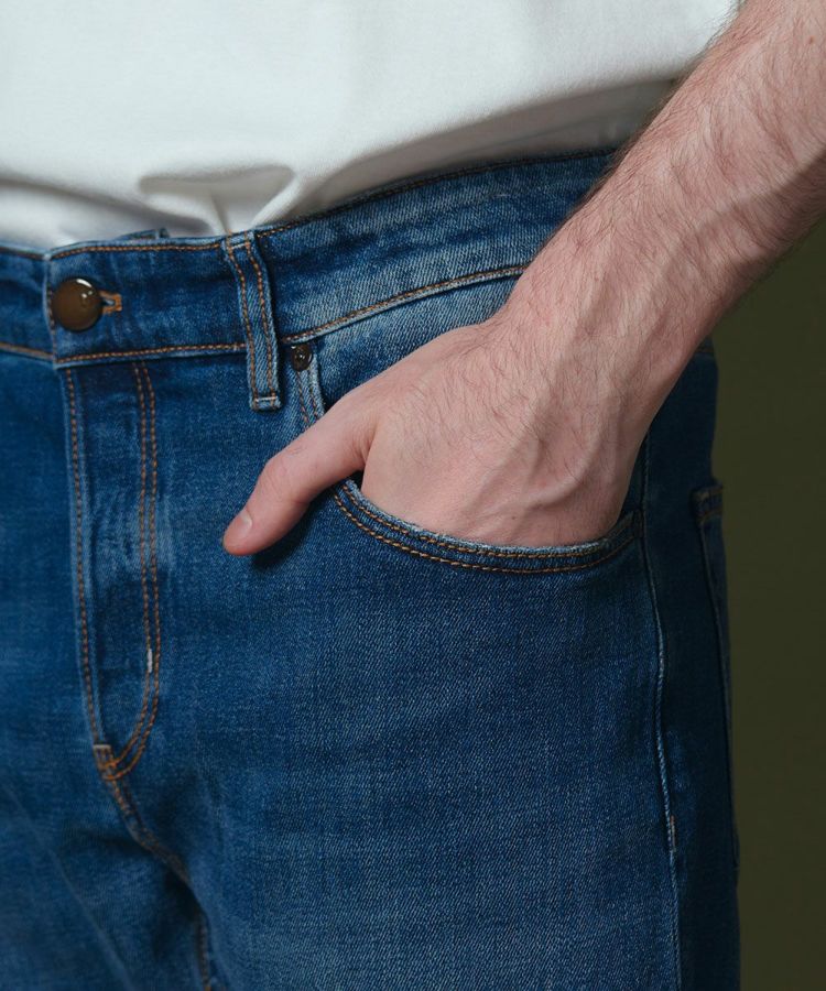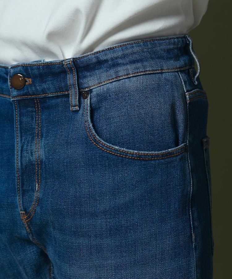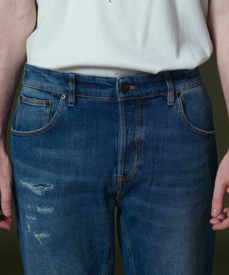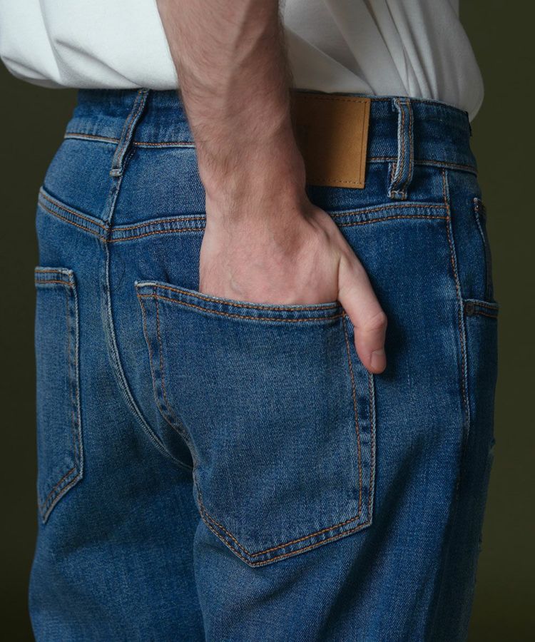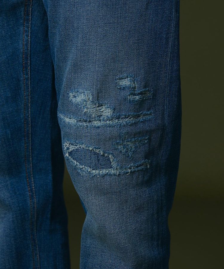 穿き込んだような絶妙な色合い、リペアのディテールが特徴になったデニムパンツ。ステッチもほのかなアクセントになっています。ヴィンテージのような風合いがありながらも、すっきりとしたシルエットやコンパクトな腰まわりのフォルムで、スタイリッシュに穿きこなせる一本。マットな質感で作ったブラウンカラーのパッチもモダンな印象で、品よくコーディネートできるのが魅力です。