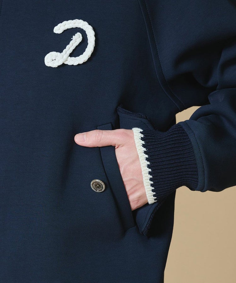 コットン100%のダンボール生地を使用した、軽やかで快適な着心地のブルゾン。裾のリブやポケット上部、衿裏にニット糸をドッキングさせ、さりげないデザイン性をプラスしました。胸元にはブランド頭文字の「D」をロープ刺繍であしらい、程よいアクセントに。季節の変わり目にも重宝し、ロングシーズン活躍する一着です。