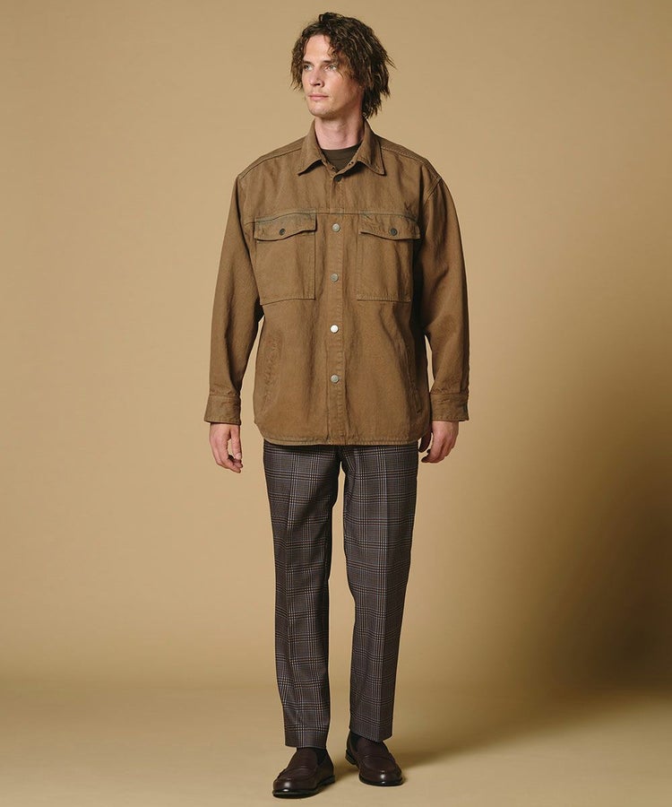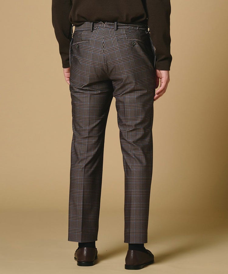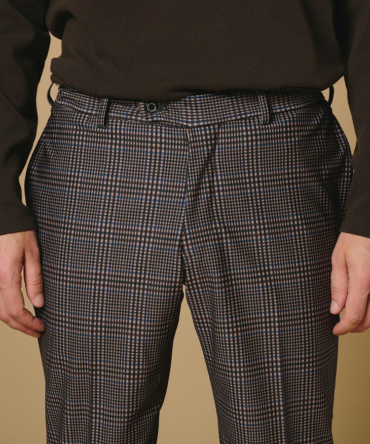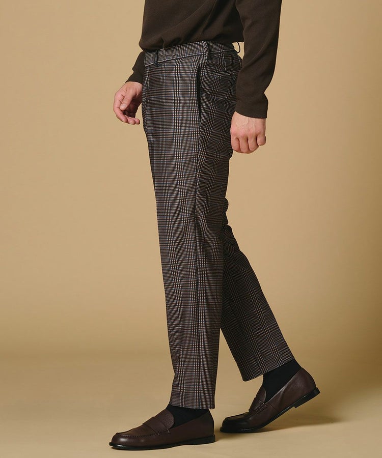 程よく反発感のあるトリコット生地に、深みのあるブラウンチェック柄をプリントしたパンツ。無地染めを施した下生地にプリントを重ねることで、表情豊かに仕上げました。落ち着いたブラウンベースのチェック柄が上品さと程よい存在感を兼ね備え、スタイリングの主役にもピッタリ。スウェットやTシャツと合わせてラフに着こなすのもおすすめです。