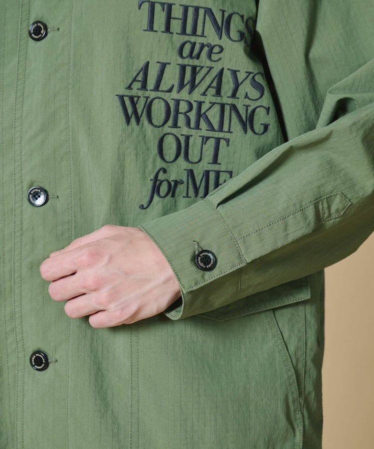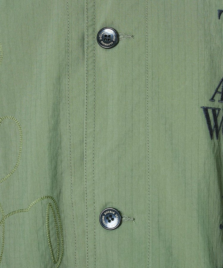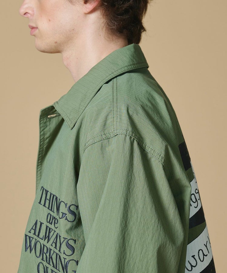 ビッグシルエットが抜け感を演出するミリタリージャケット。コーマ糸のオーガニックコットンとリサイクルナイロンを交織したリップストップ生地に、特殊反発+光沢仕上げ加工を施しました。大胆に配したニジタロウモチーフとロゴ刺繍が、唯一無二の存在感を放つ一着に。同素材のパンツ(型番:0706131261)と合わせれば、統一感のあるミリタリーテイストのセットアップスタイルも楽しめます。