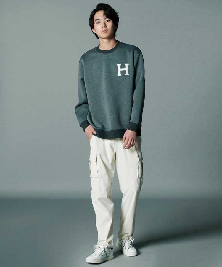 独特の柔らかな膨らみがリラクシンな印象を与えるダンボールニットのトップス。なめらかな表面感と上品な光沢感があり、カジュアルになりすぎずきれいめに着られるのが魅力です。程よくゆとりを残しながらも、すっきりとしたシルエットに仕上げているのもポイント。胸元のHのワッペンがアクセントになっています。
