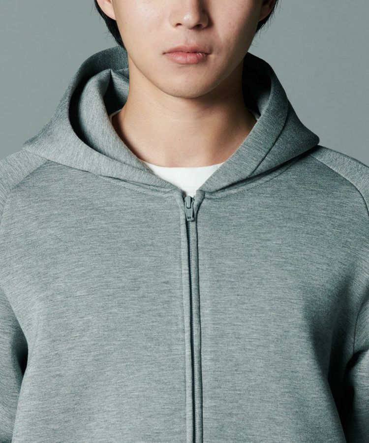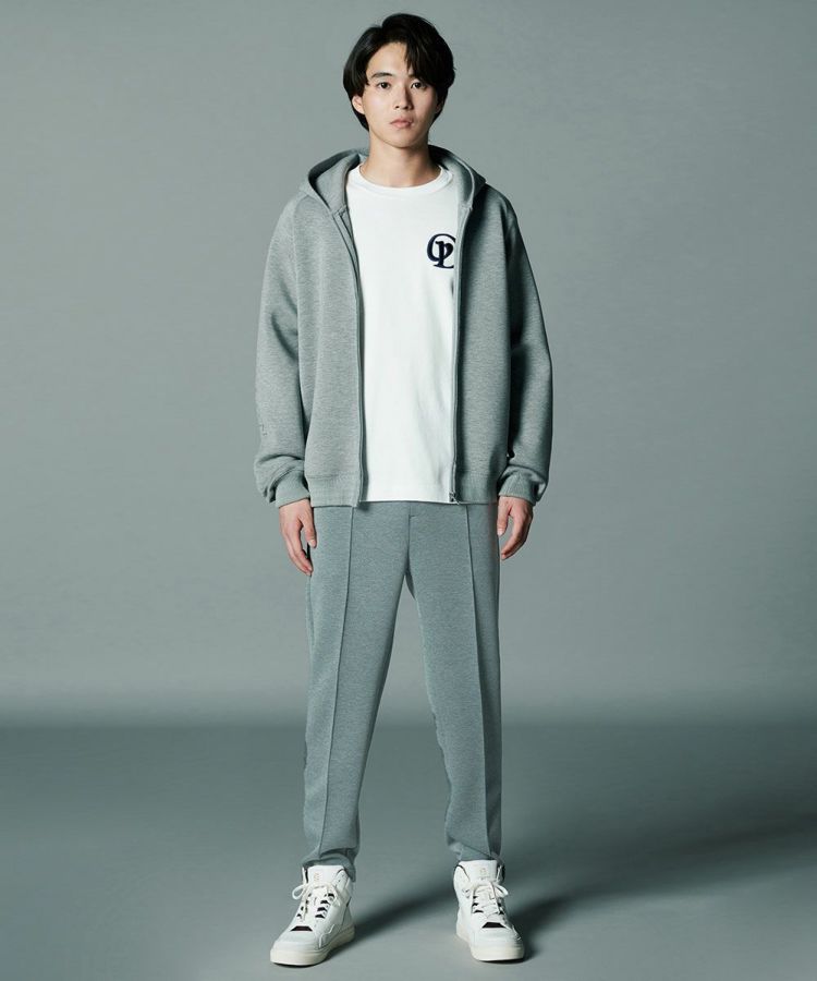 しっかりとした落ち感のあるダンボール生地を使用したジップパーカー。型を起こし樹脂を流し込んで表現したこだわりの凹凸ロゴを袖にあしらい、唯一無二のポイントにしました。ゆったりとしたオーバーサイズシルエットで、さっとラフに羽織れる一枚。なめらかな表面感なのでカジュアルになりすぎず、上品な印象を与えてくれるのが魅力です。